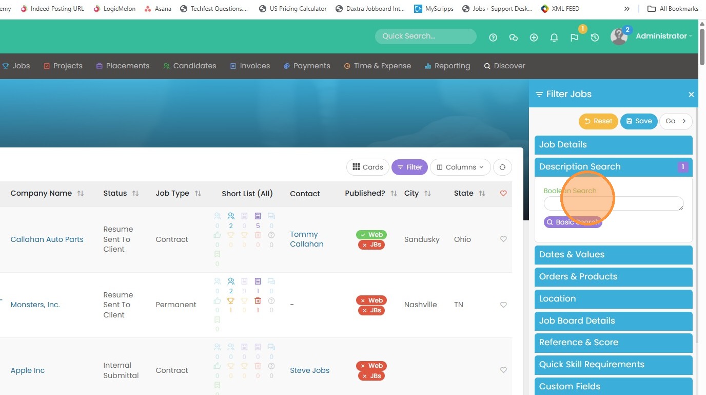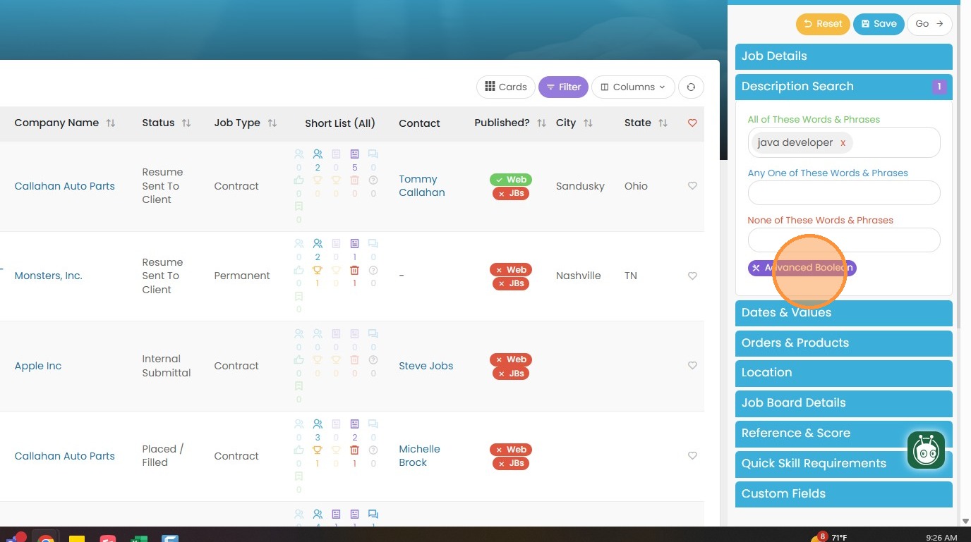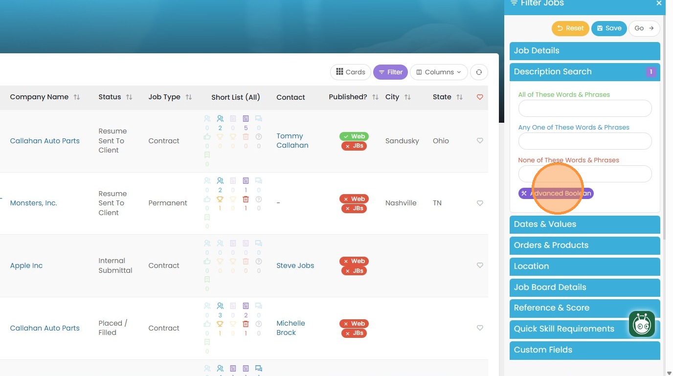 2. This is helpful if you need to filter jobs using a boolean search for certain keywords or phrases. For example, if you need to find candidates that were shortlisted in a job that had a specific job description using the keywords "java developer" in "Columbus, Ohio" this will help you find those specific candidates.
