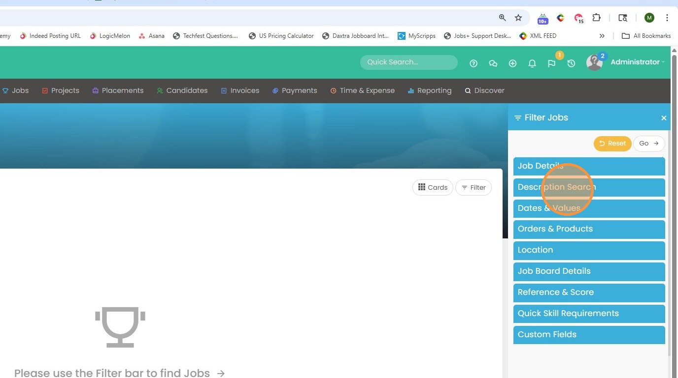 1. In the jobs main list view, there is an option under Filter that allows you to run a boolean search on job record's description field.