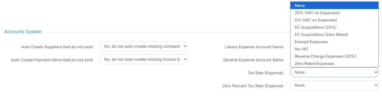 20. Next are a number of options for "Tax rate" including Exemptions, No VAT and Zero Rated options. Select which is most appropriate for your organisation.