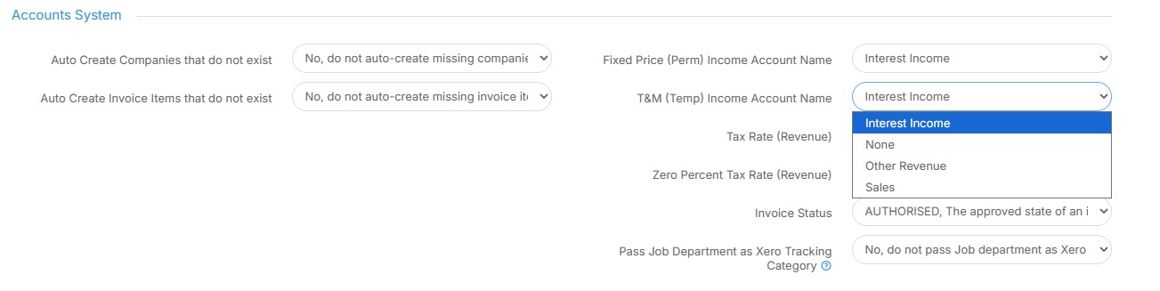 19. The next setting is "T&M (Temp) Income Account Name". Your options here are as follows: Interest Income, None, Other Revenue or Sales.