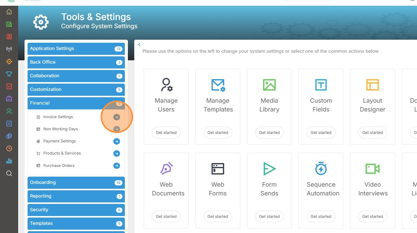 14. Within Tools and Settings scroll down and expand the Financial menu.