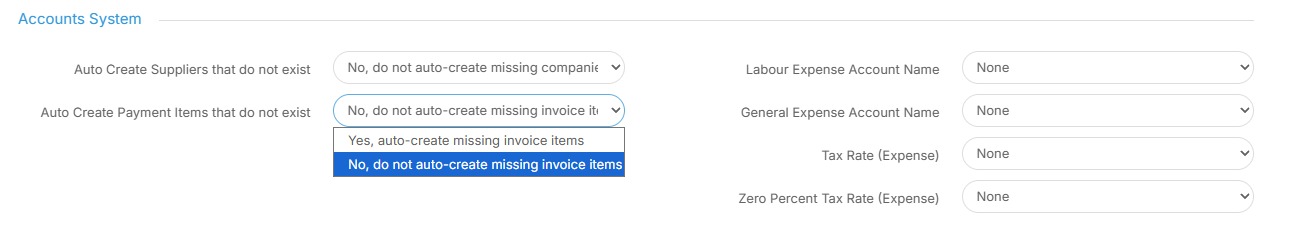 26. As with Invoice Settings, there are 2 options: "Auto Create Suppliers that do not exist" and "Auto Create Payment items that do not exist"