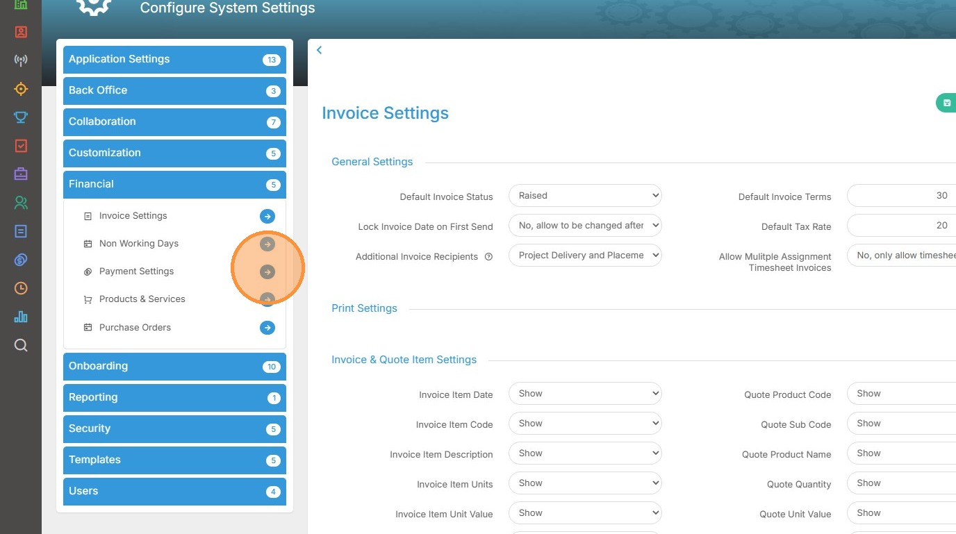 25. Back under the Financial sub-menu on the left select Payment Settings. Scroll down to the Account System Settings area.