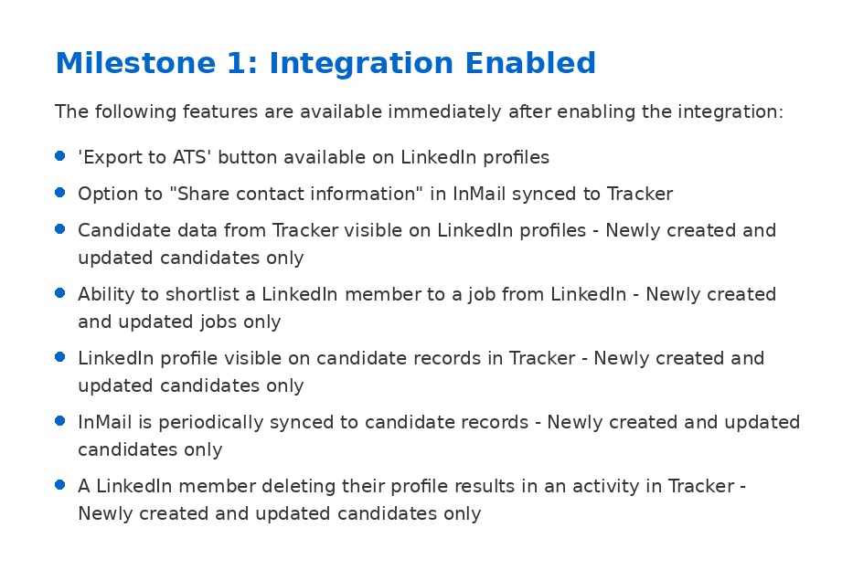 When enabling the LinkedIn Recruiter integration, many of the integration’s features will be immediately available to you to start using, however, some require a background data synchronisation task to complete before being enabled, see the Feature Enablement Milestones section below for more details.