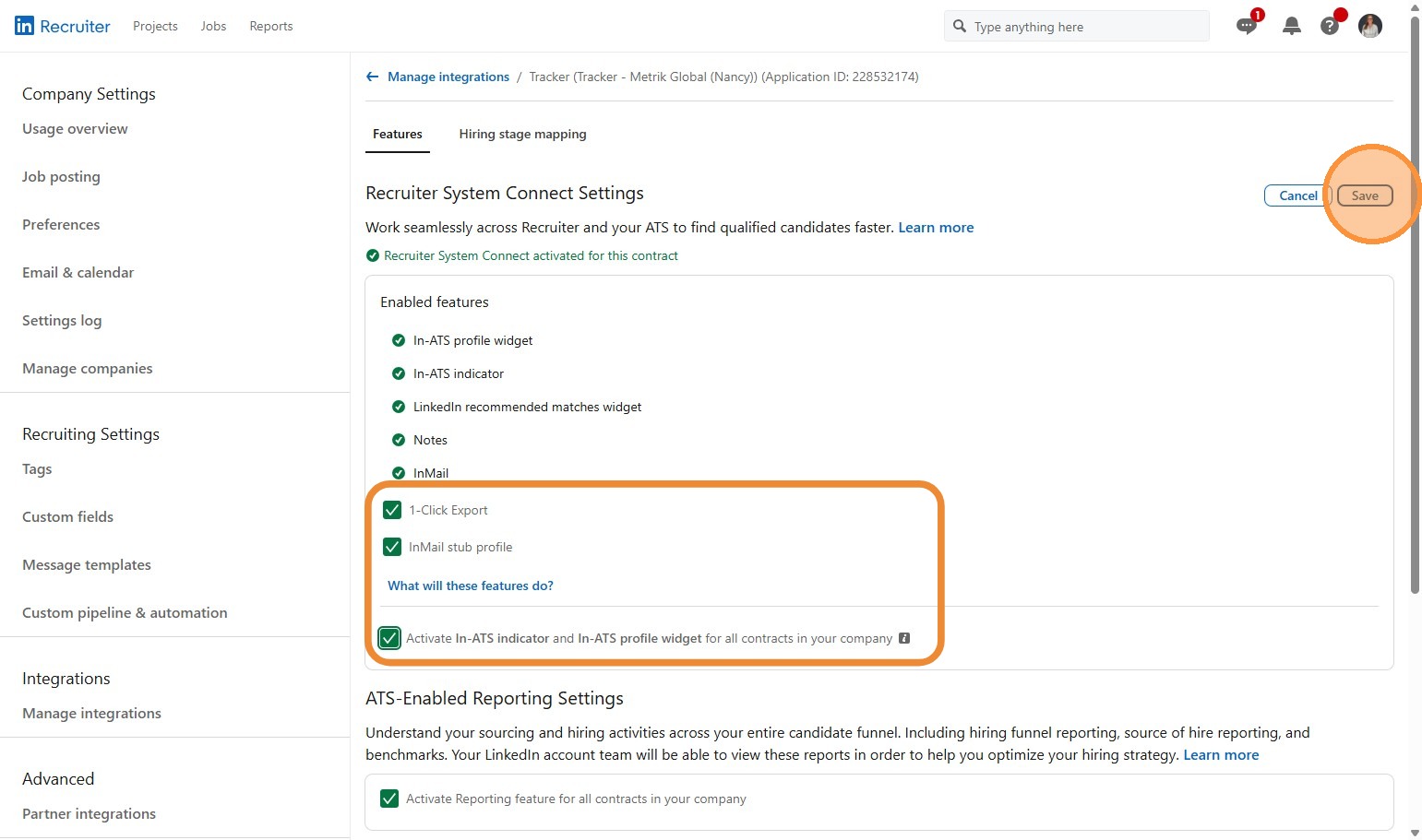10. Once the integration is synchronised, from within the LinkedIn Recruiter account that has been invited to the LinkedIn Integration Contract you will need to ensure a couple of settings are enabled (you will only need one user to do this).