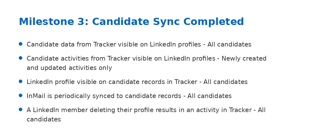 - A LinkedIn member deleting their profile results in an activity in Tracker - Newly created and updated candidates only