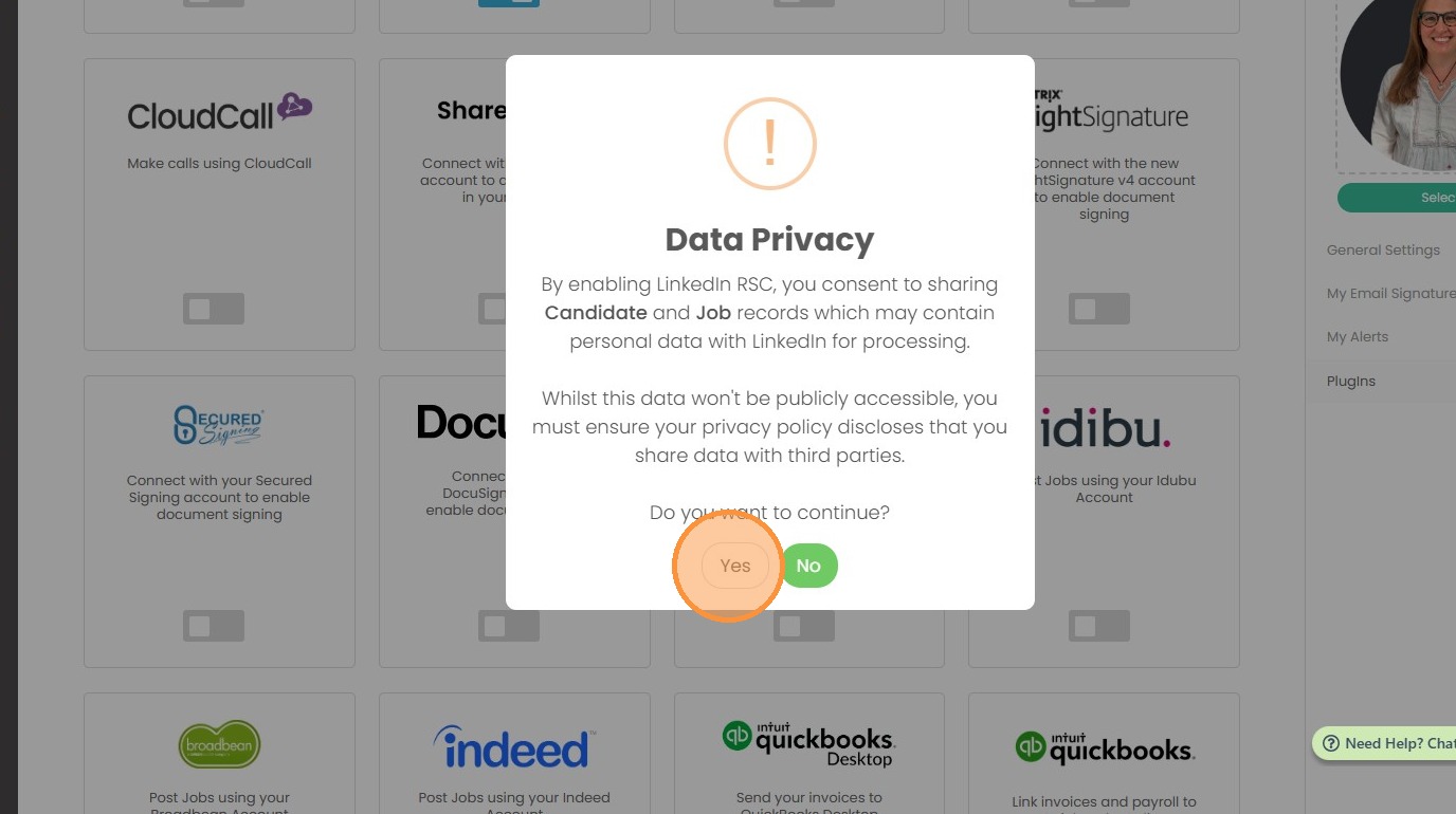3. A Data Privacy warning will display, this is because as part of the sync between Tracker and LinkedIn you’ll be sharing Candidate and Job data that has been created or modified in last two years, therefore confirmation to proceed is required.