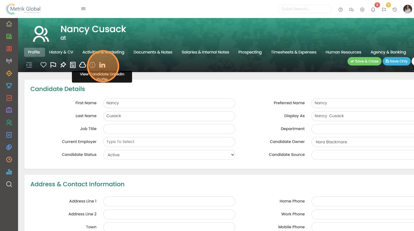 1. In the name banner of candidate records you will have the LinkedIn icon.