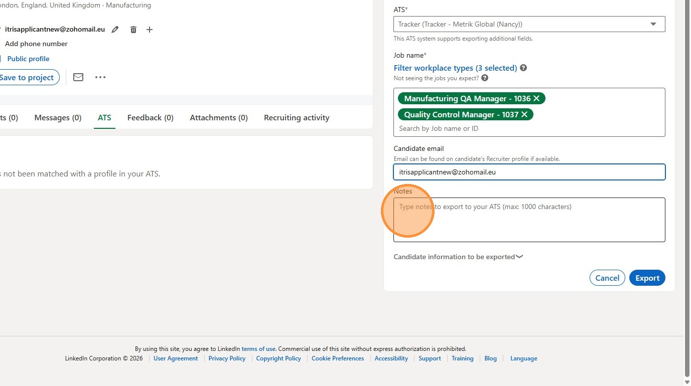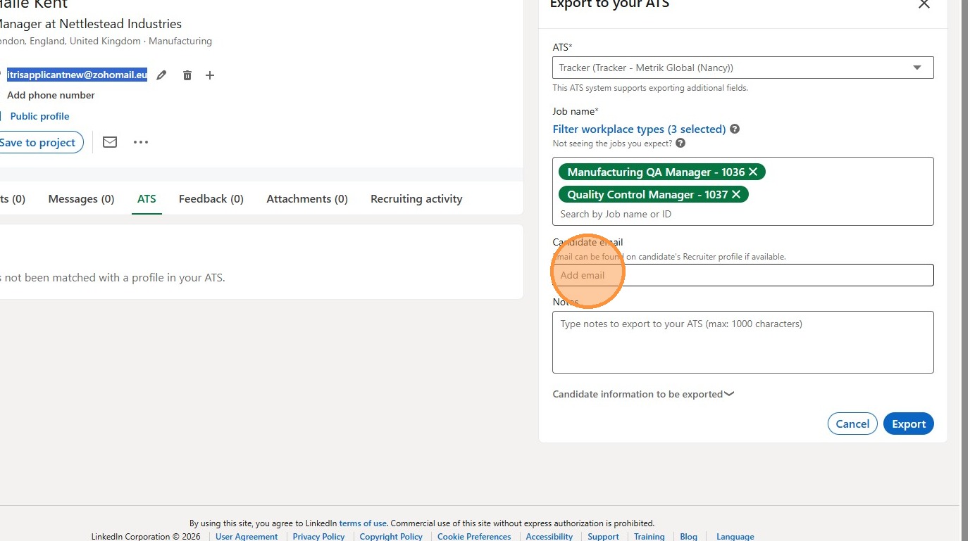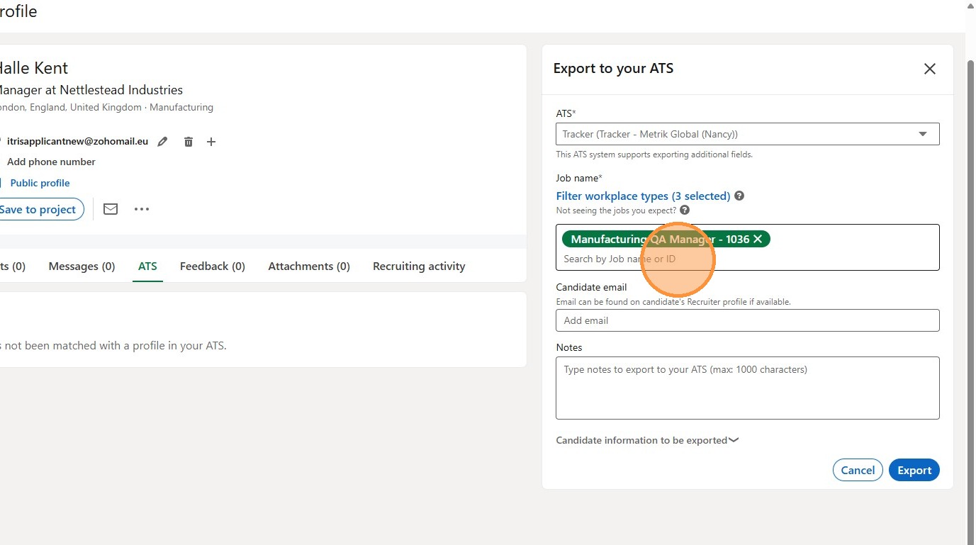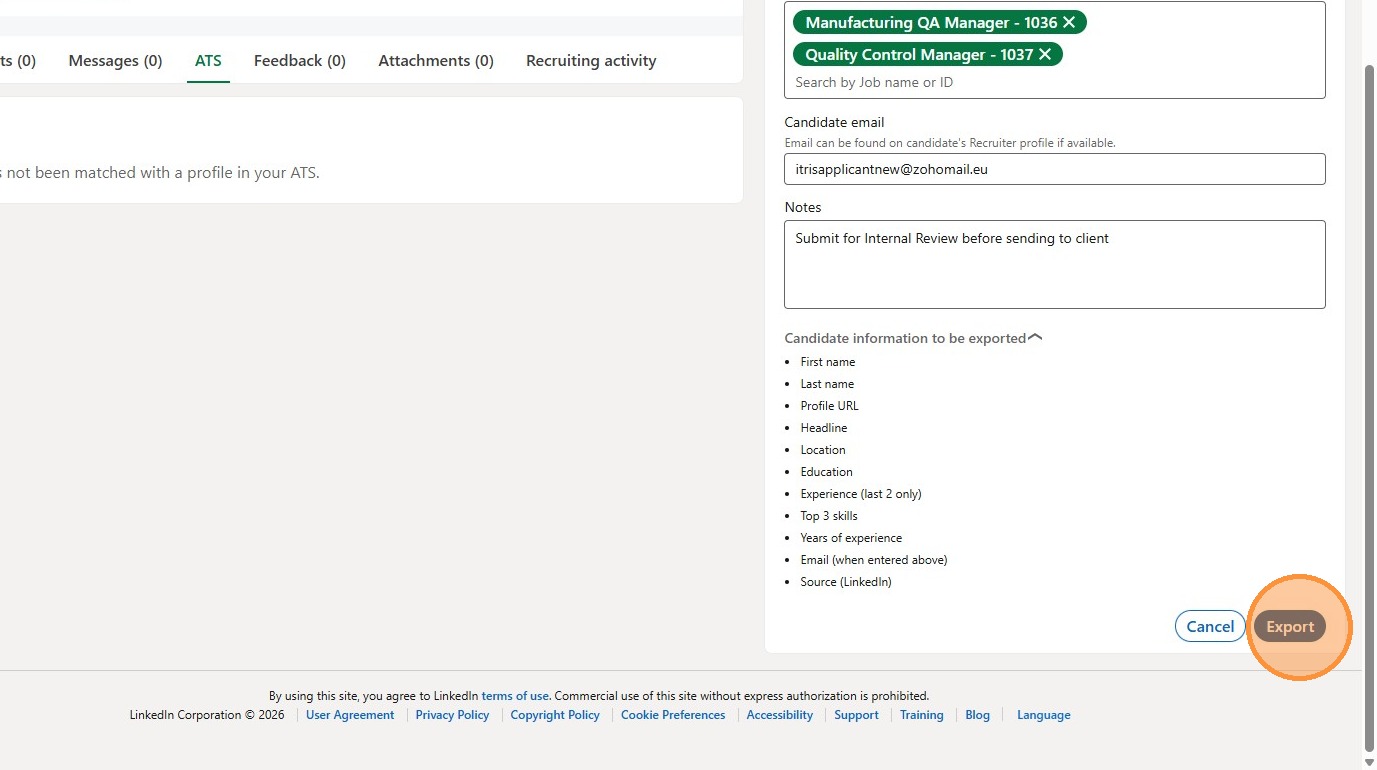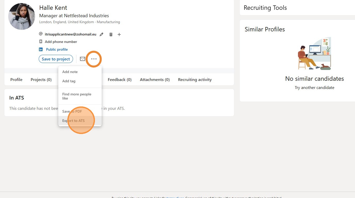 9. Via the ellipses in the LinkedIn name banner you can choose to Export to ATS.