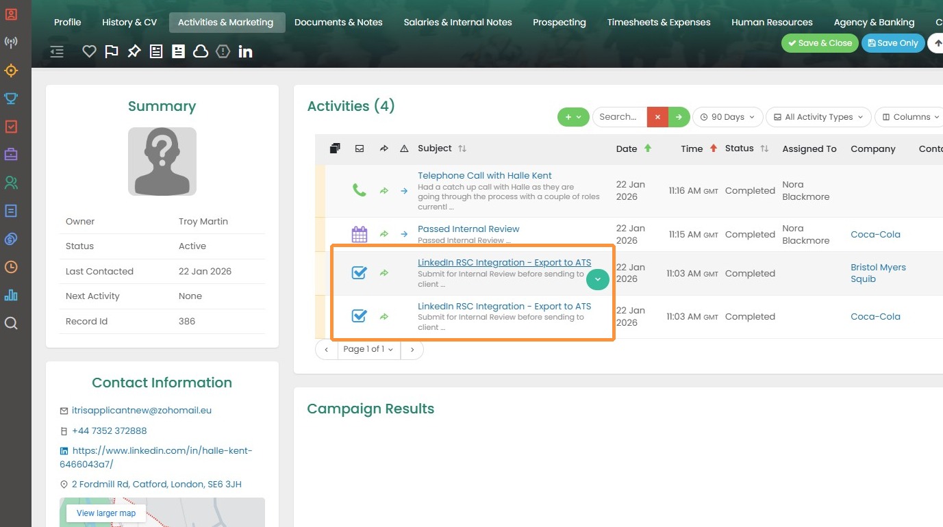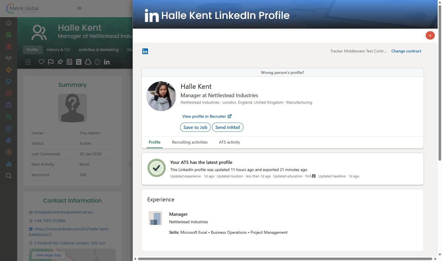 16. Refreshing the LinkedIn person record will update the ATS tab and show an Export Summary, a link to the Tracker record (under Profile Information) and details of the Job(s) shortlisted for.