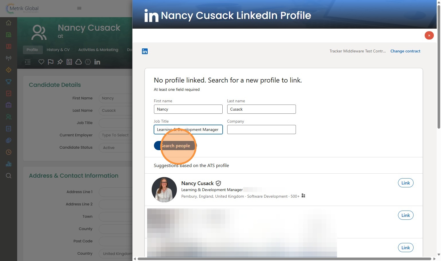 Where a Tracker candidate record is not synced (for example if you don’t have the email address at the point of creating the record) , or if you need to re-match with another LinkedIn profile you can search for a new profile link via the Candidate record LinkedIn widget and link to that record.
