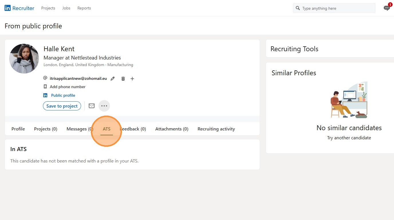 8. From LinkedIn, where a persons profile record is not already synced with Tracker the ATS tab will show they are not matched.