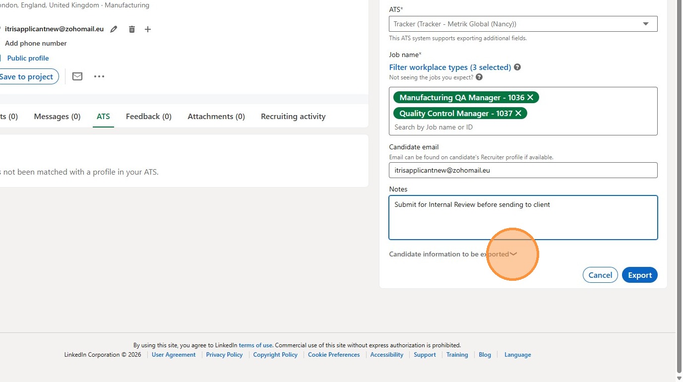 14. You can expand the section “Candidate Information to be exported” to see the details of which data (if available on the LinkedIn record) will be exported to Tracker.
