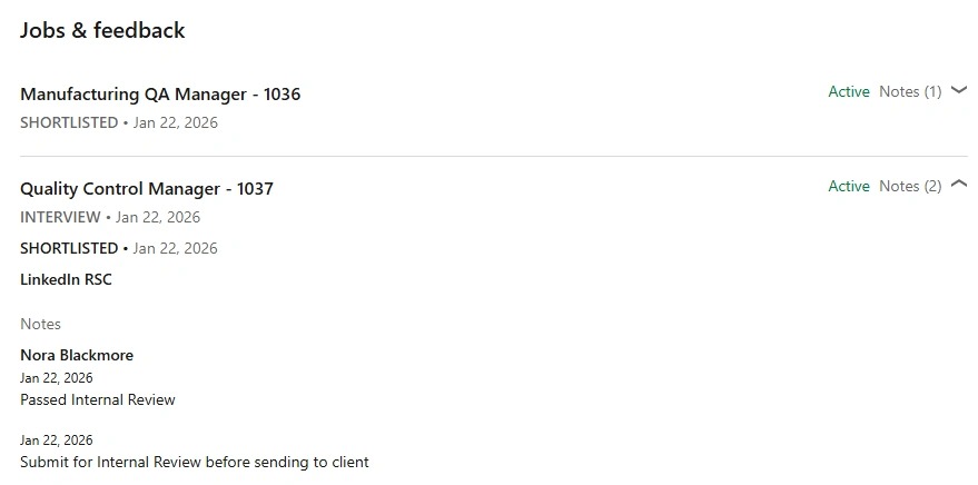 6. Jobs & Feedback shows a history of Jobs shortlisted to and subsequent submission stages (e.g. Shortlist, Interview, Offer) so you can view and track their progress from within LinkedIn.