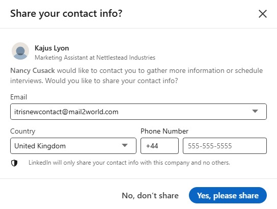 20. As you may know, when you initiate a conversation with somebody via LinkedIn Recruiter using InMail, once you start that conversation with them LinkedIn will ask them if they want to share their contact information with you. If they choose to share it these details will be synced to Tracker.