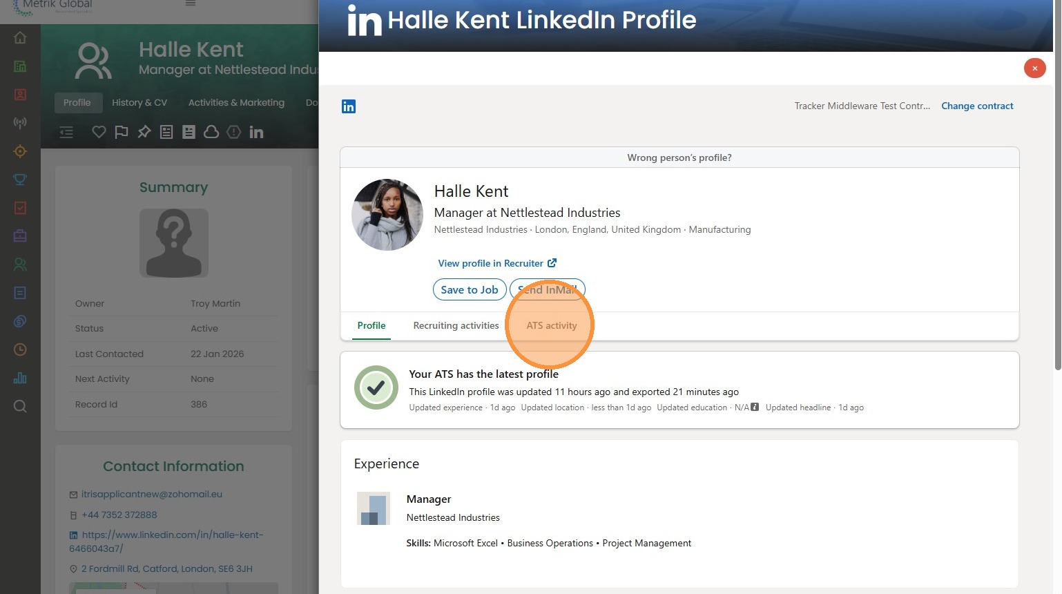 4. When viewing a synced record from LinkedIn there will be an ATS tab that shows information shared between the two systems.