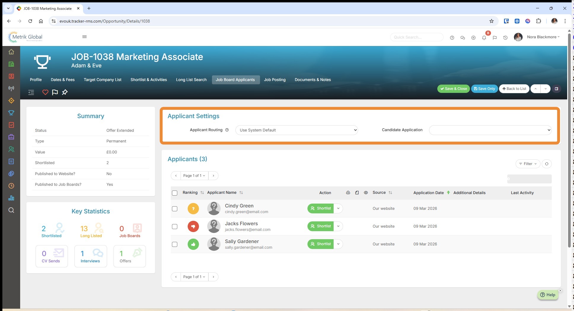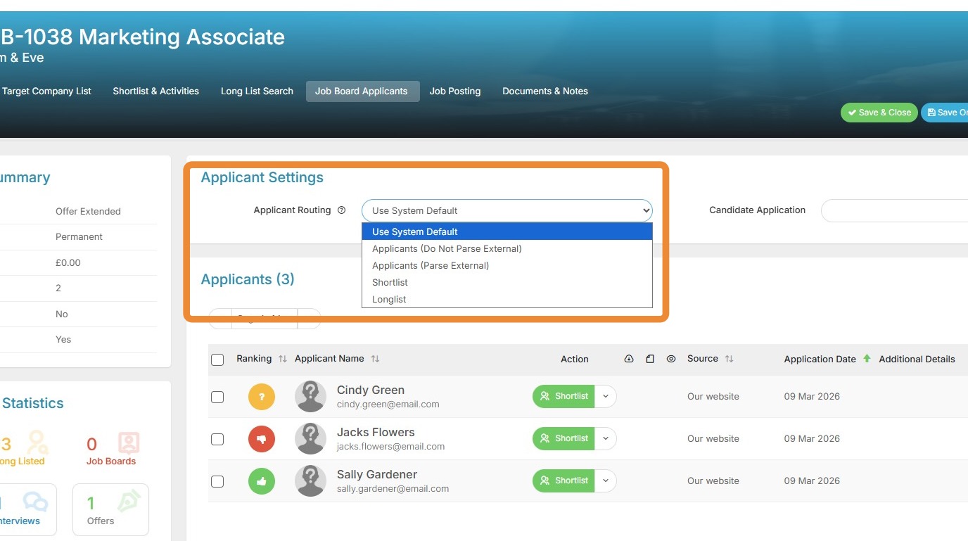 1. There are two settings on the Applicant Settings block available on Job Records, and these are related to how candidates who apply via job boards are handled.