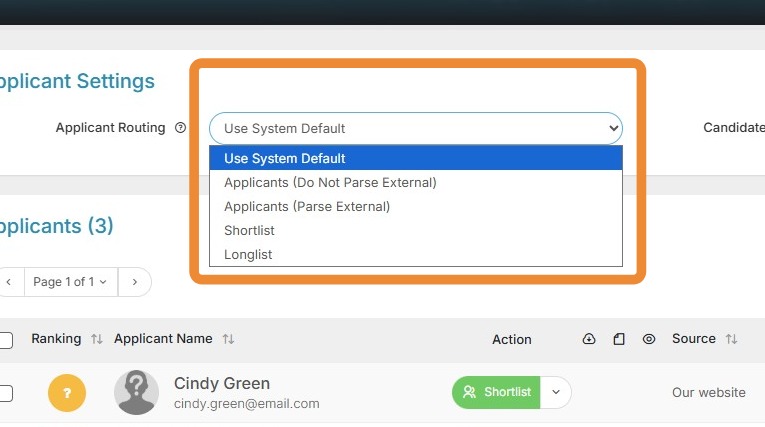 2. The first setting is Applicant Routing, and is related to Parsing Controls. When an application comes in, you can choose exactly what happens next.