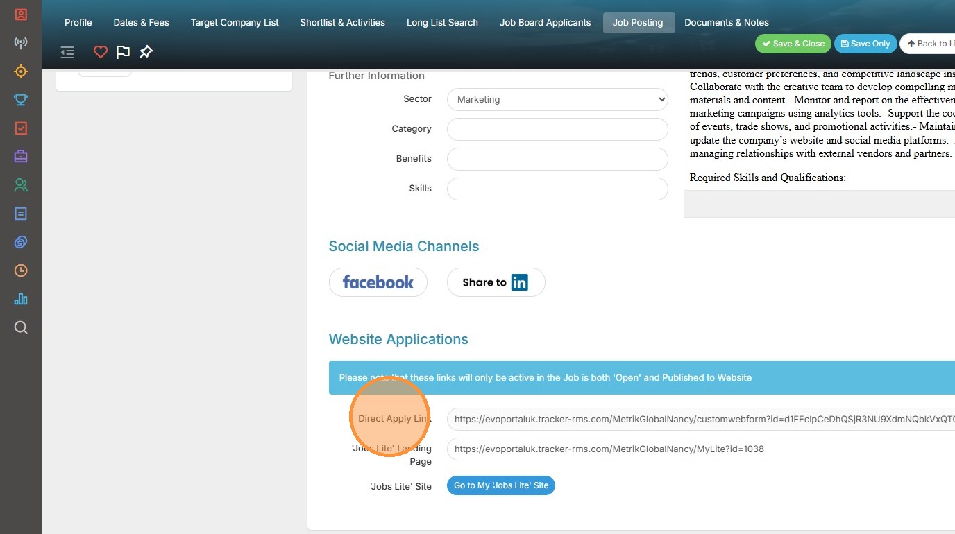 5. If you select a web form under Candidate application, this setting will pull through to the Website Applications block, overriding the standard Apply form and automatically updating the Direct Apply link in the Job Posting tab.