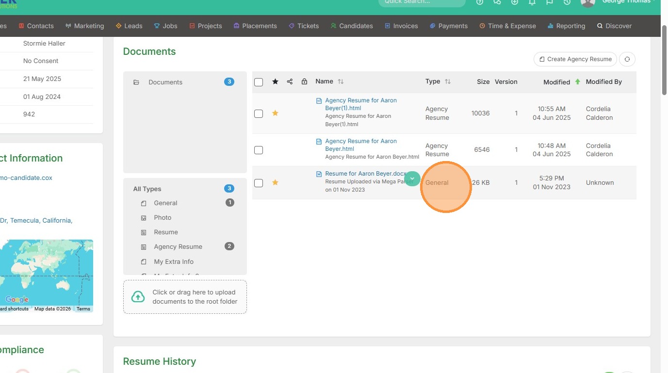 2. You will see this resume is marked as a General document, which means it won't be searchable in the Longlist or resume section of Tracker.