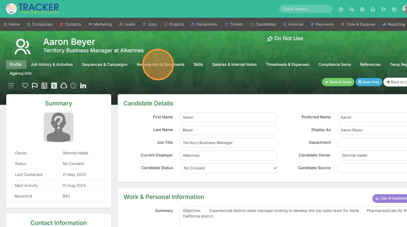 5. Now this resume can be indexed/searchable in all areas of Tracker.