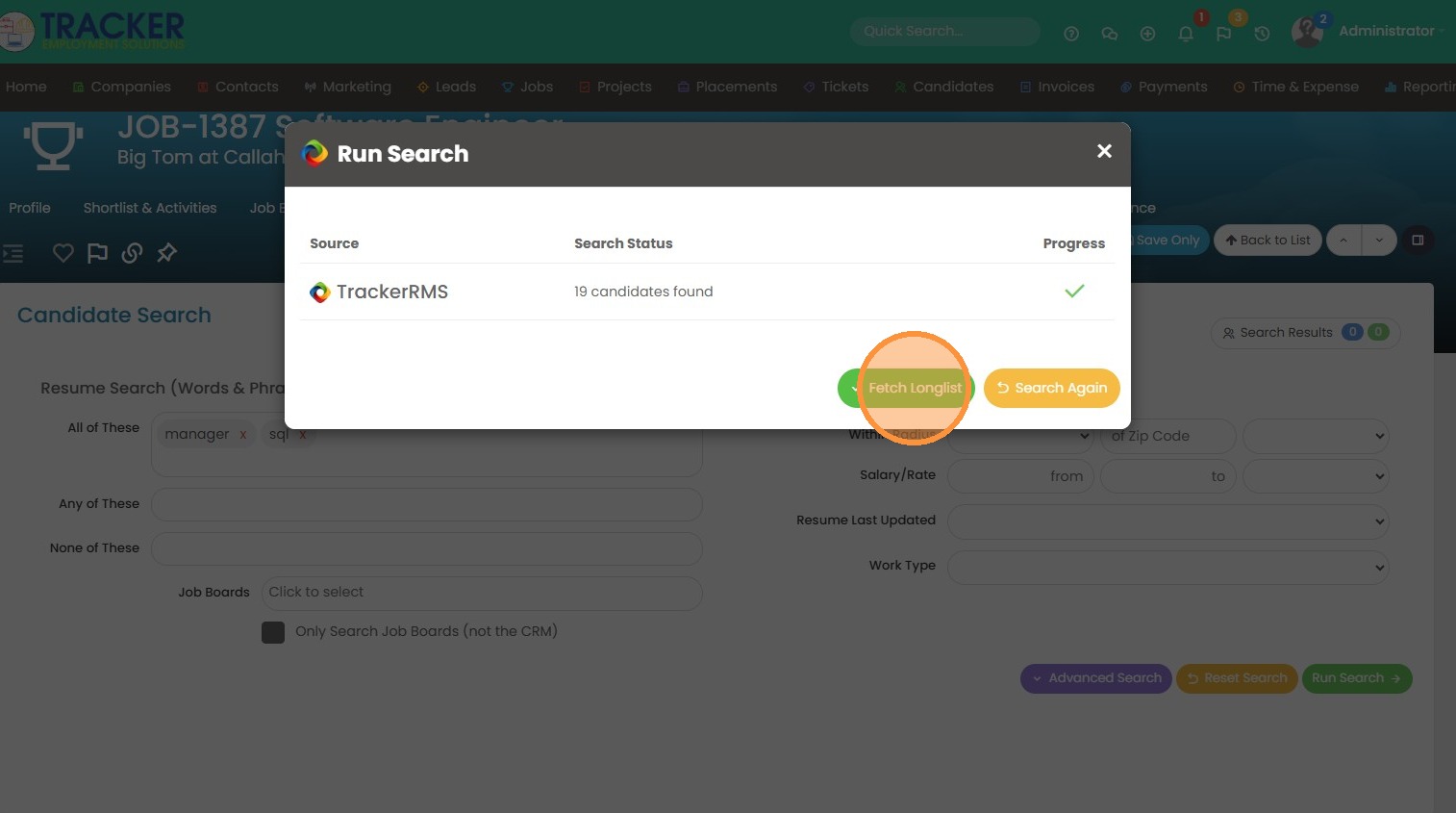 8. You will then receive this popup showing you how many candidates were found with the search terms "Manager" and "sql" in their resumes in TrackerRMS. You can either select Fetch Longlist to start your vetting process, or Search Again to add more criteria/find more candidates