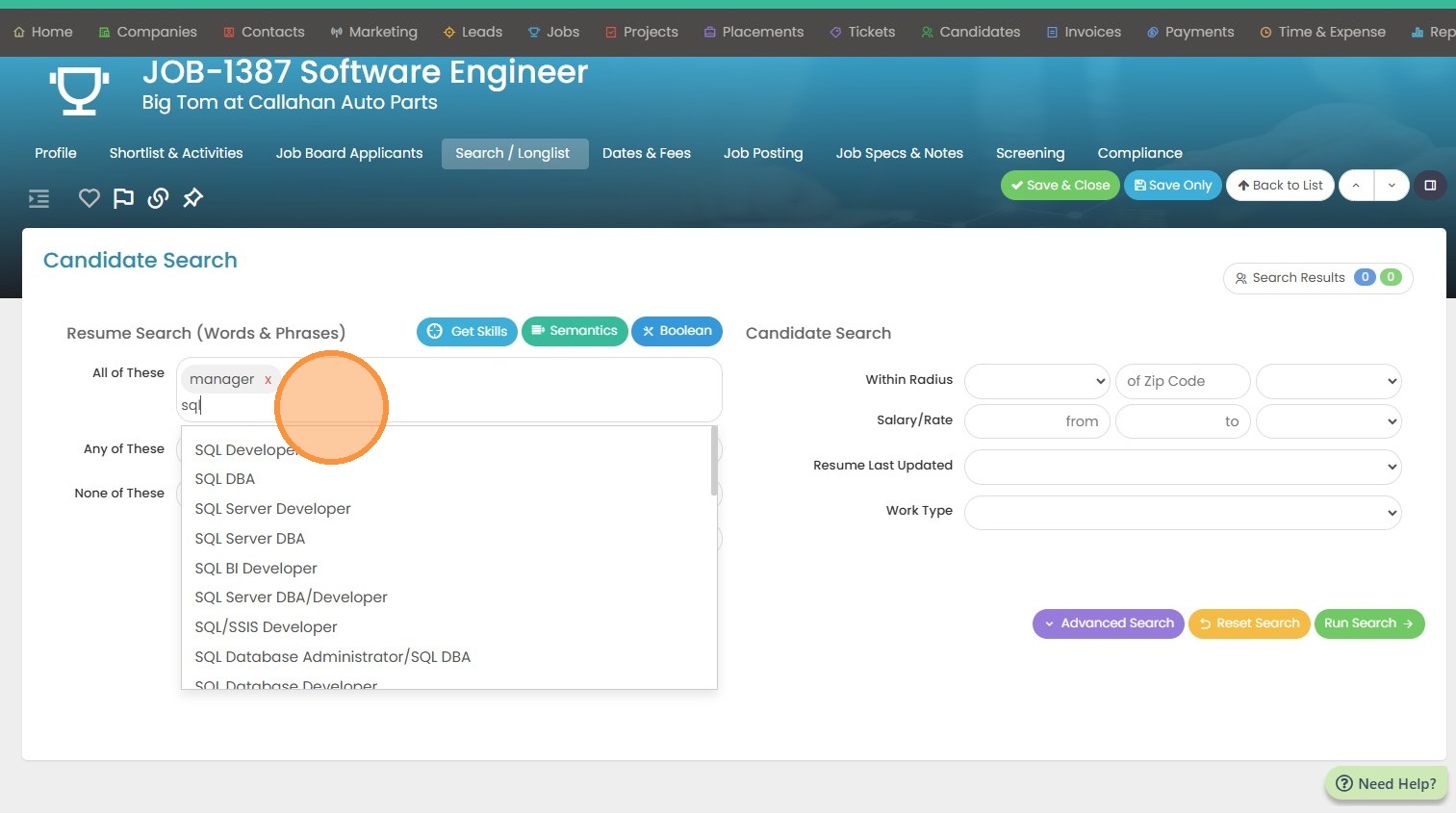4. For example, I added "Manager" and "sql" into the "AND" search criteria. This is saying I want to pull candidates that have Manager AND sql in their resumes. This is a requirement for me.