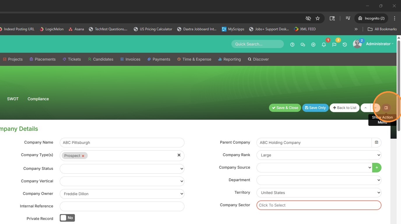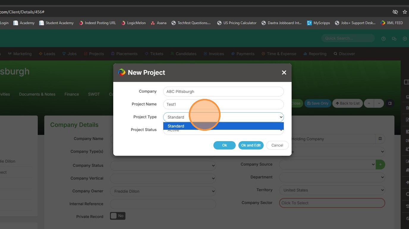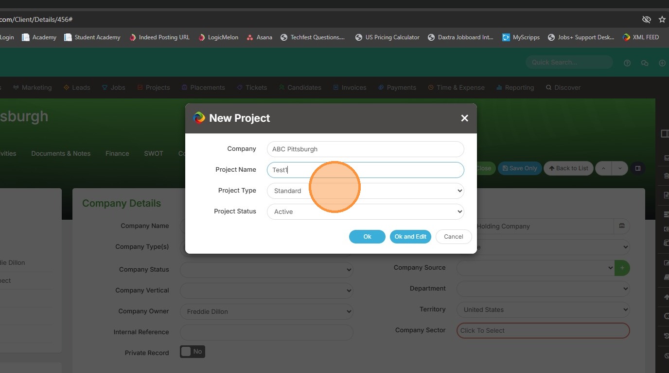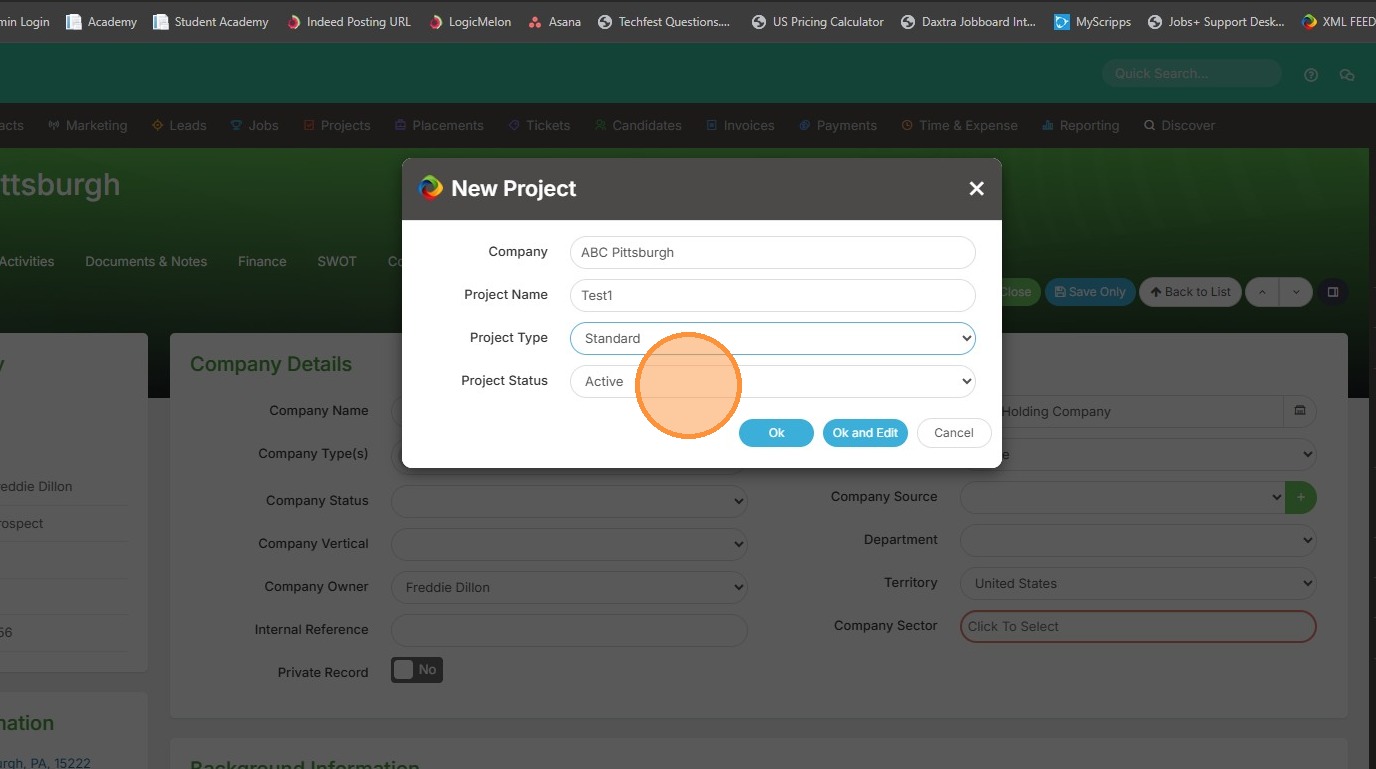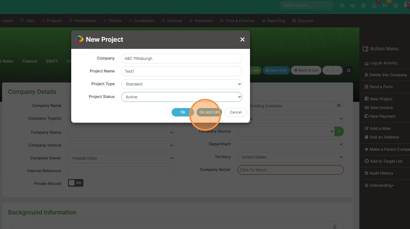 6. Click "Ok and Edit" to open the new project immediately. If you click Ok, it will keep you on the client record.
