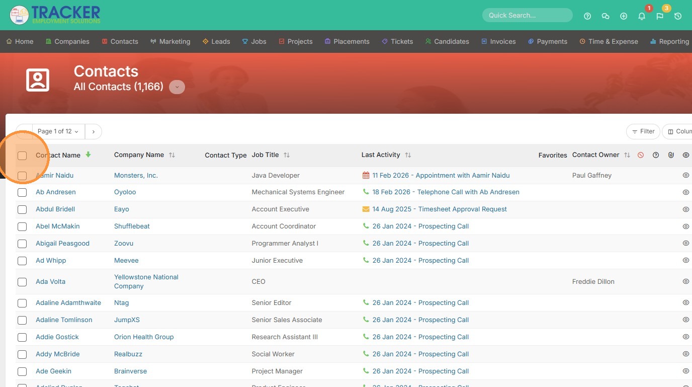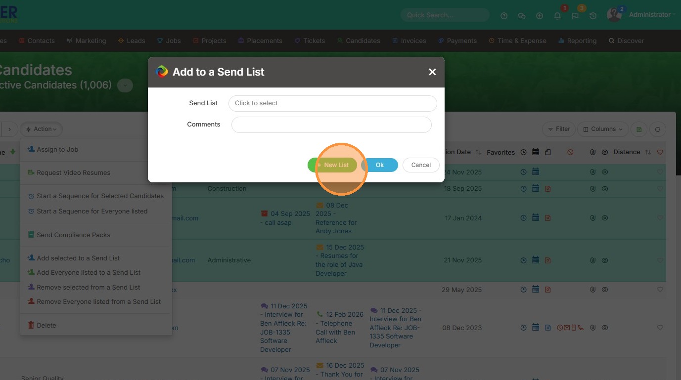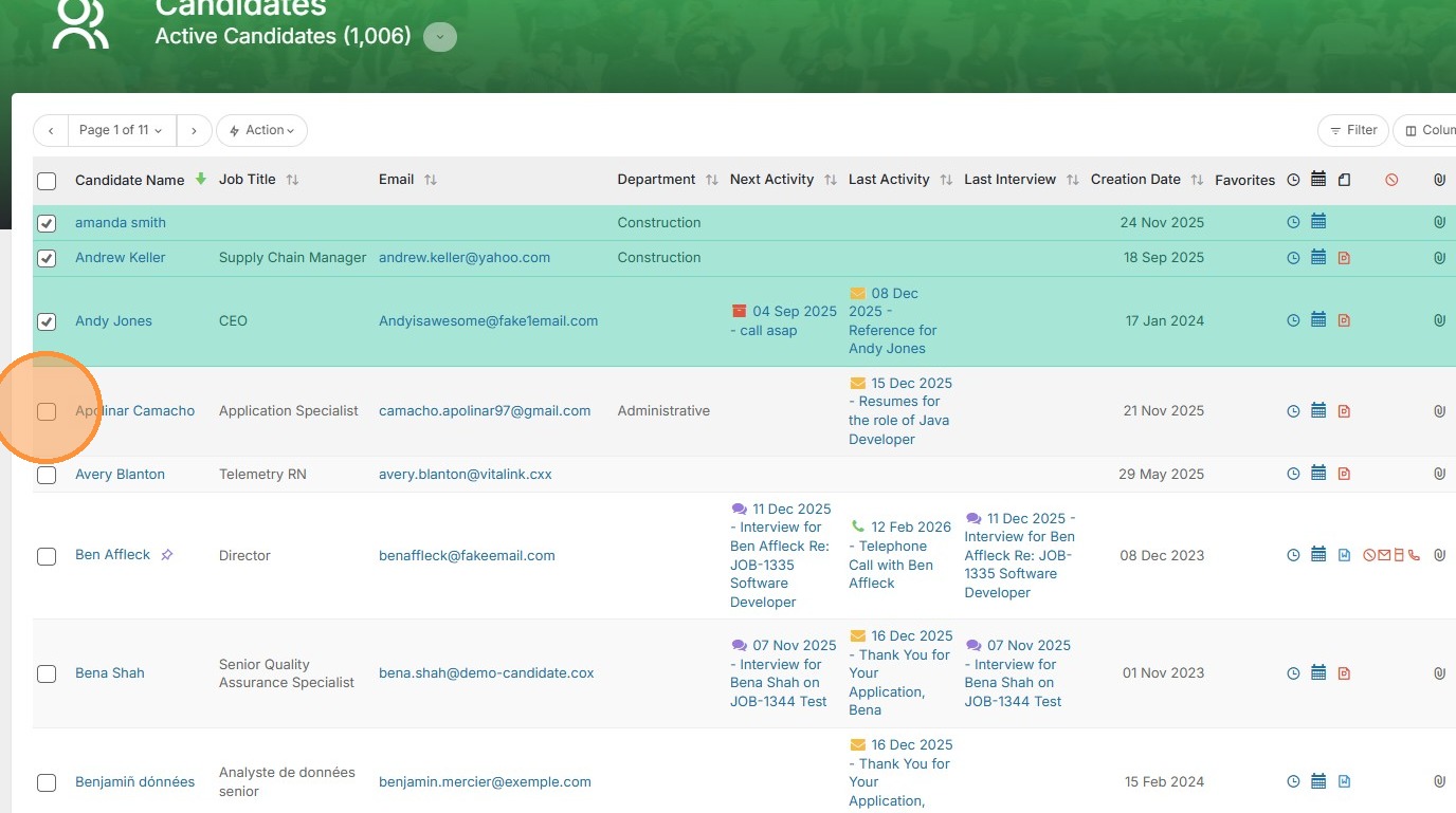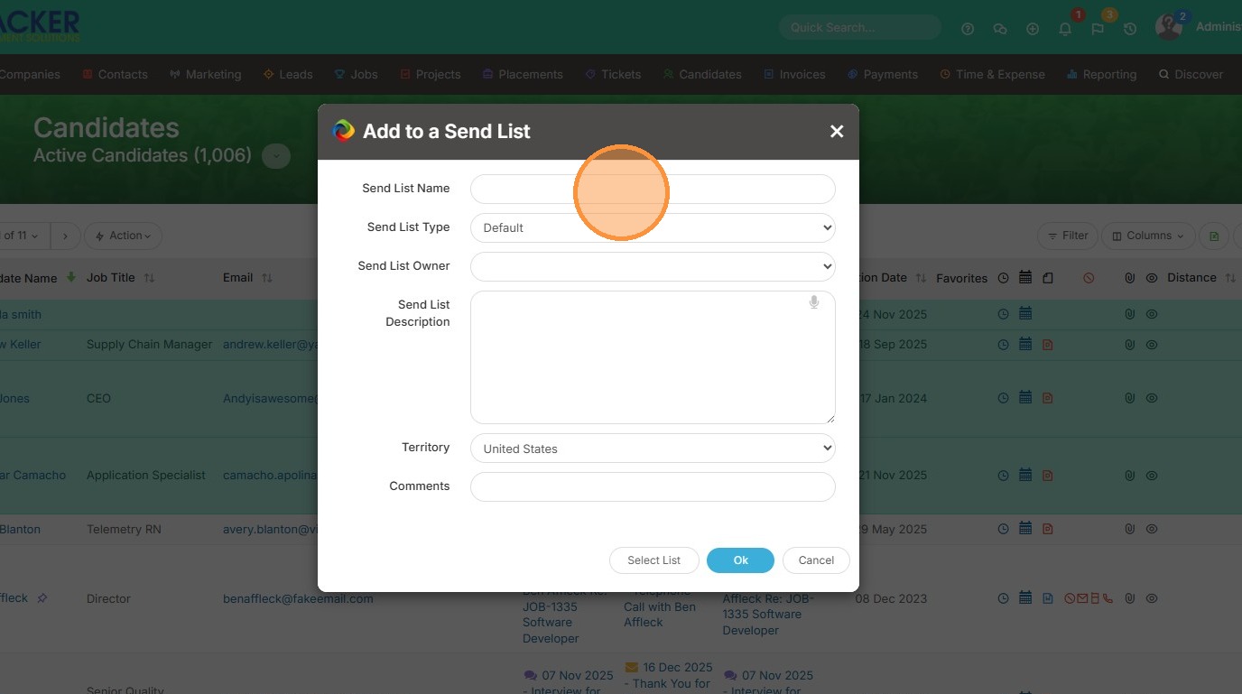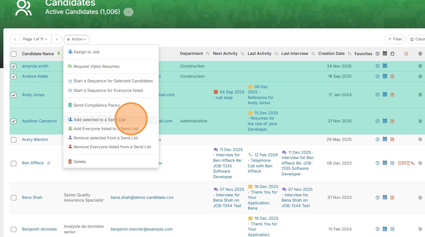 1. Open up a candidate or contact list view. Select the candidates you would like to add to a sendlist.