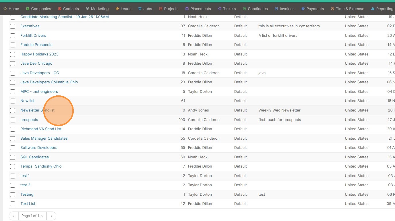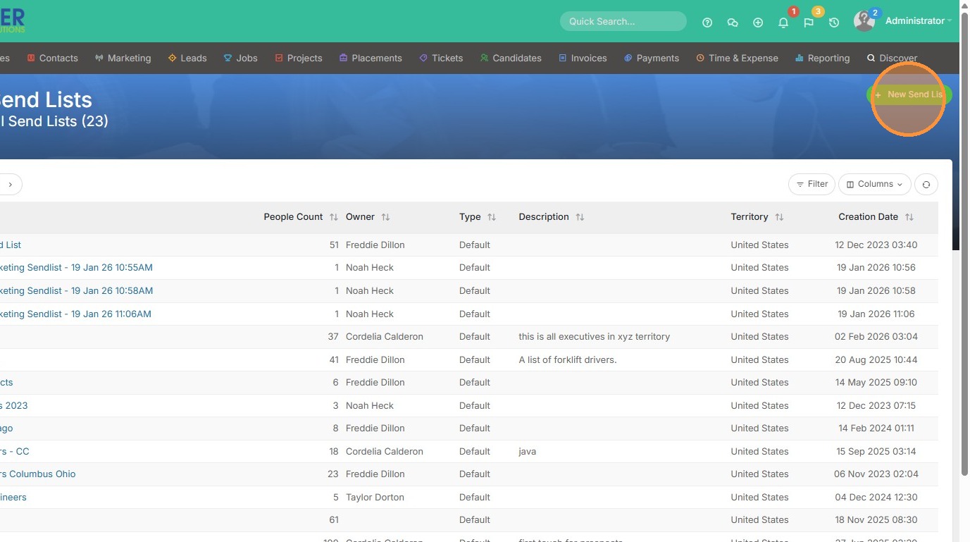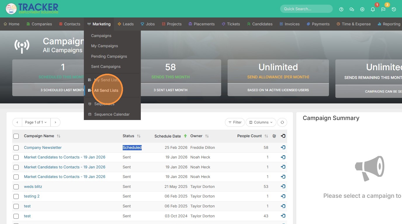 1. Click "All Send Lists" from the Marketing tab dropdown.
