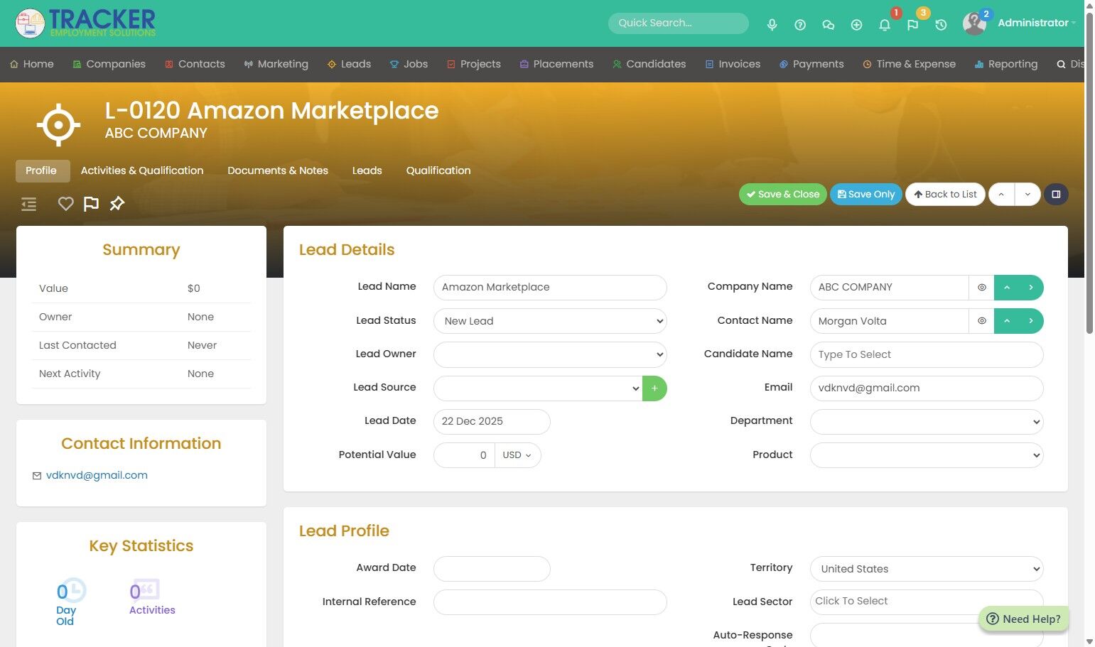 2. You can create a lead on a prospective client, and follow all of the steps until you make it an actual client. You can also use leads on prospective jobs and candidates.