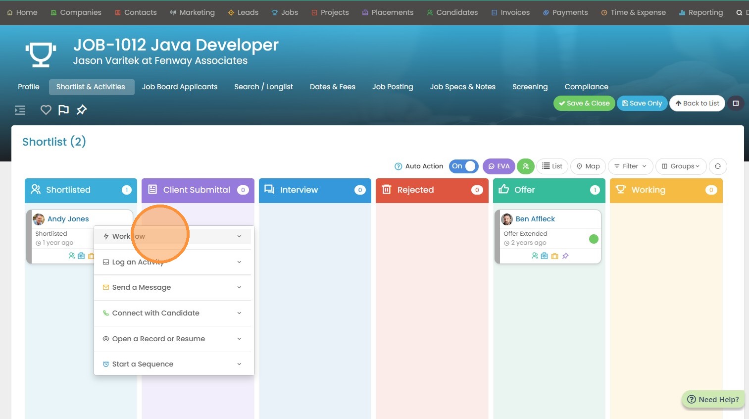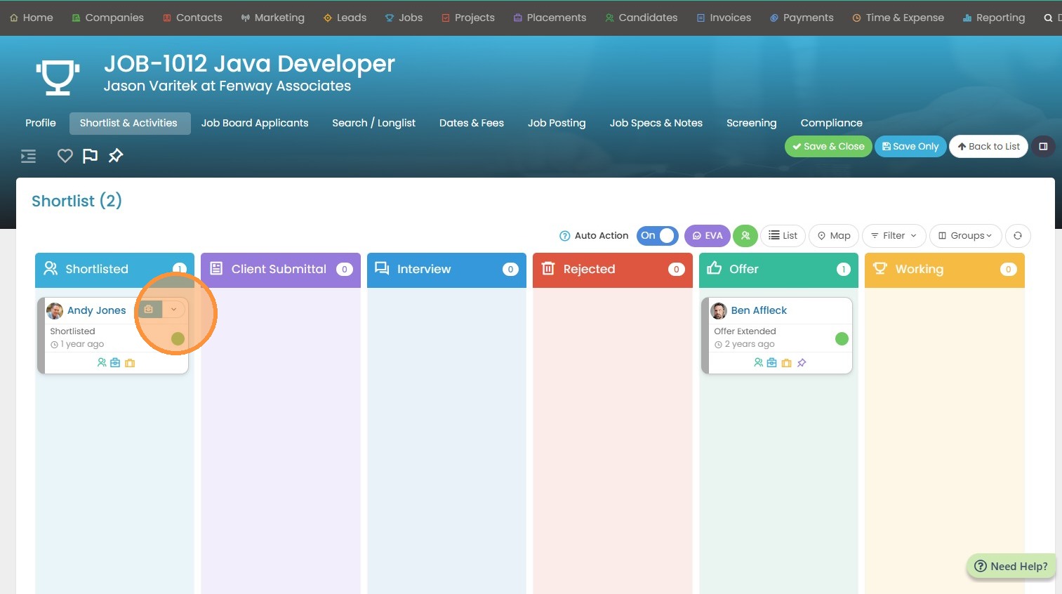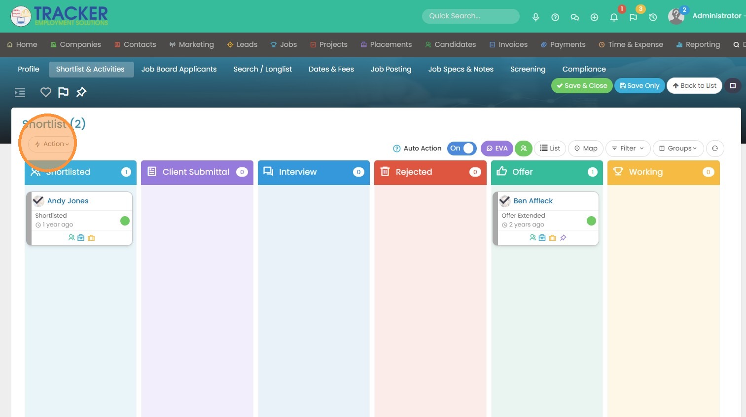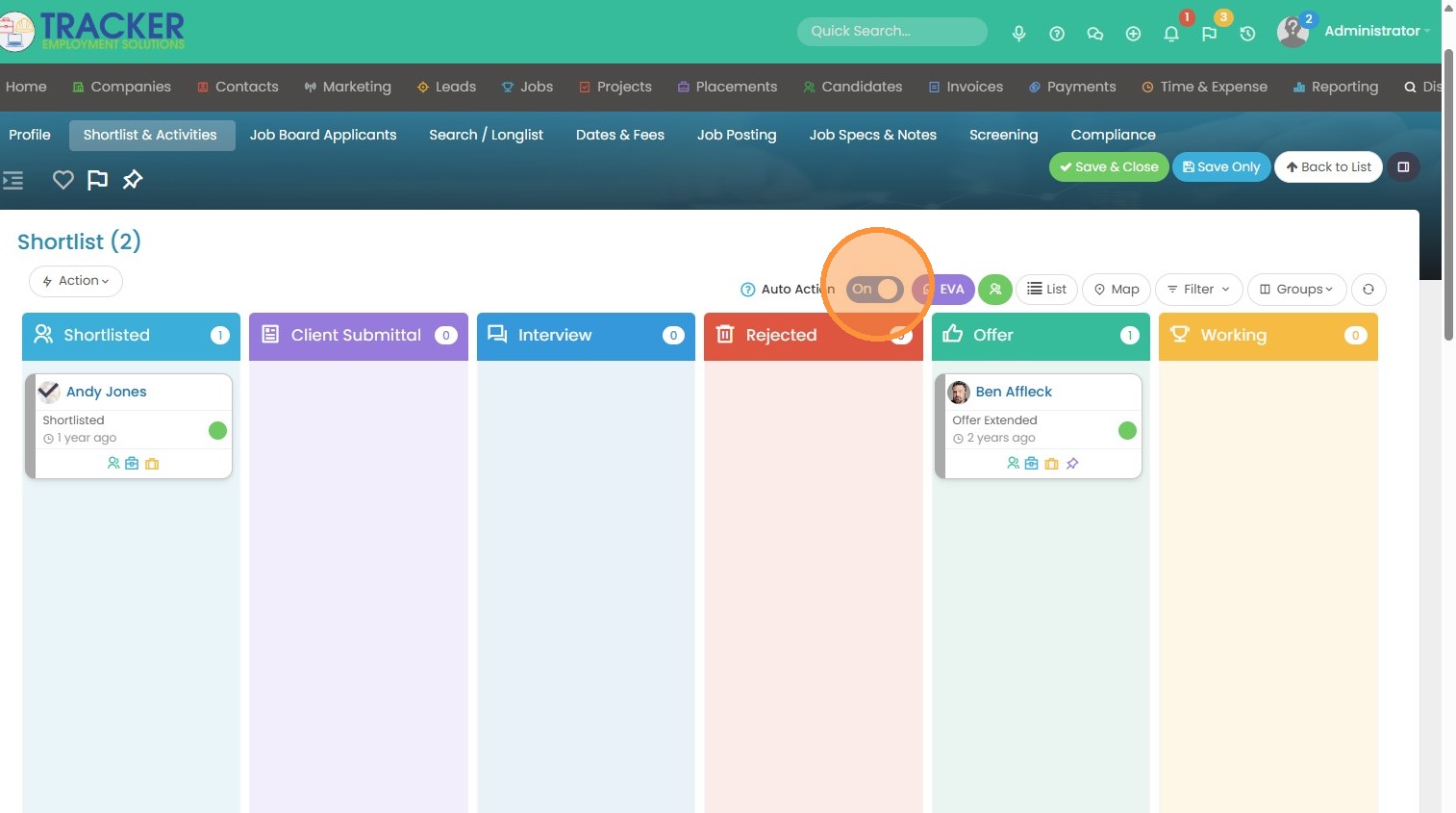 11. Moving on, we have an Auto Action button off to the right here (if you don't see this, please connect with your system Administrator). Toggling this on will make it so any time you drag a candidate forward in the shortlist, it will automatically remind you to complete the activity associated.