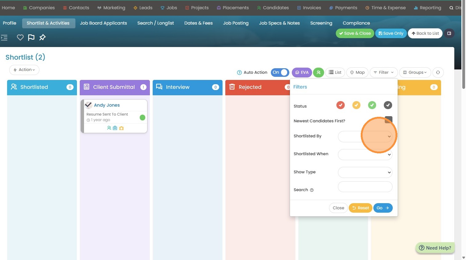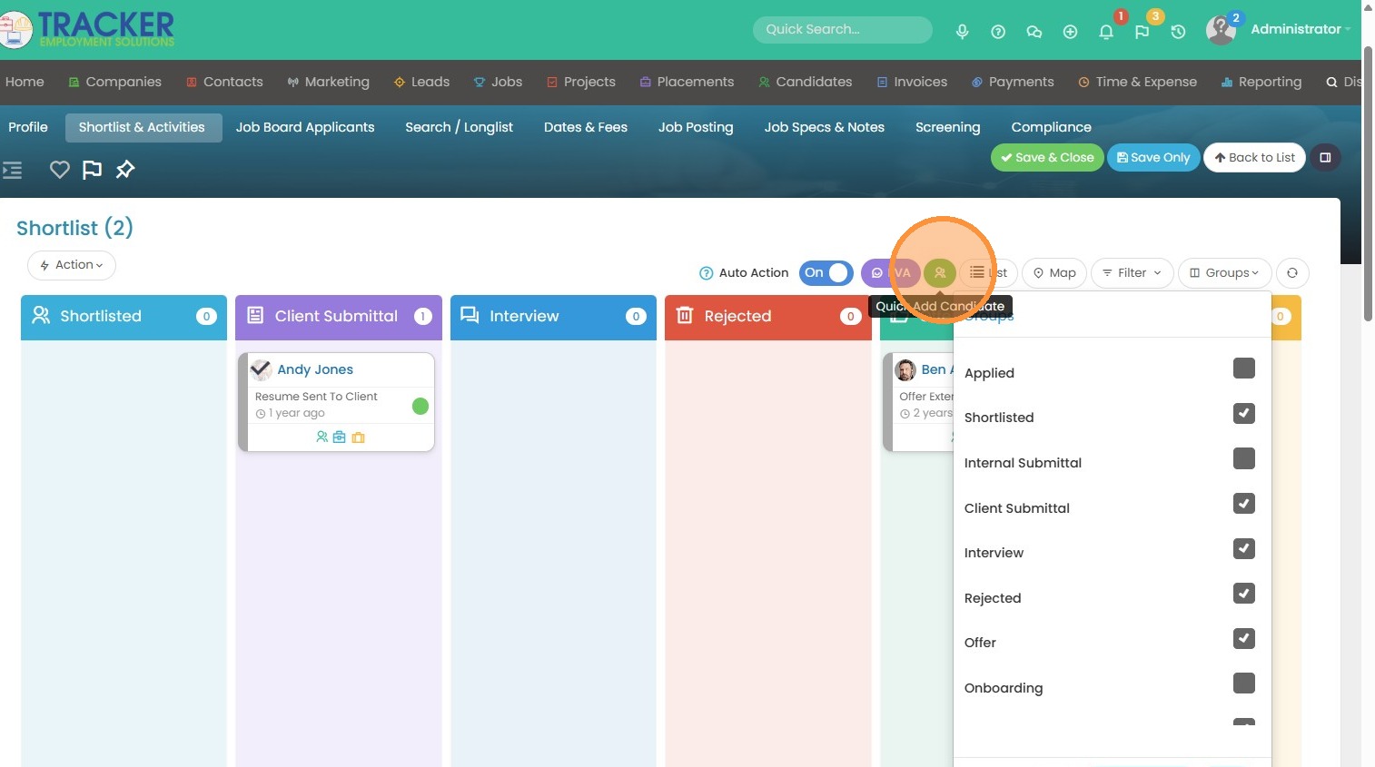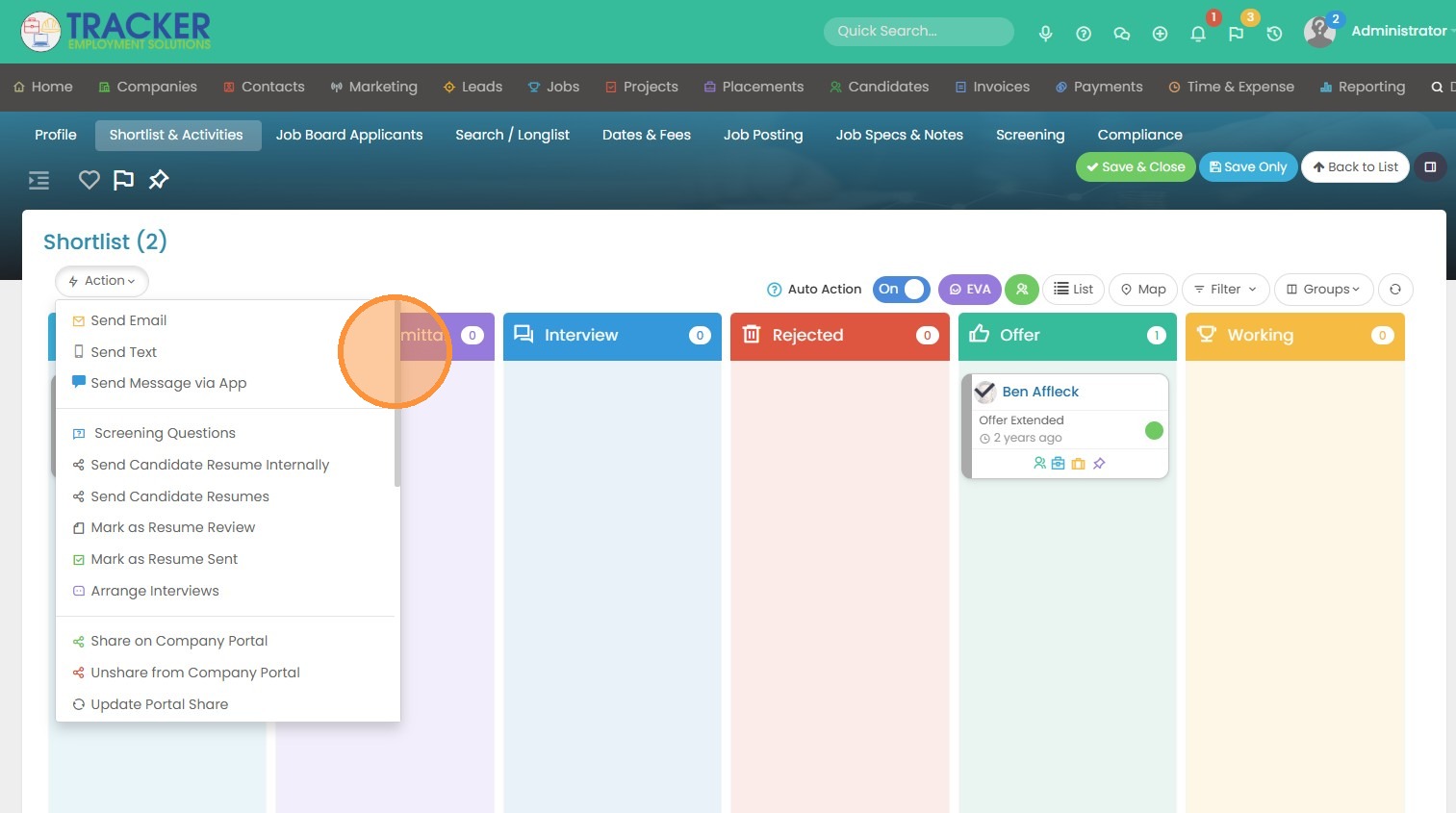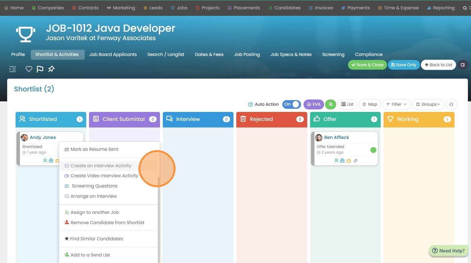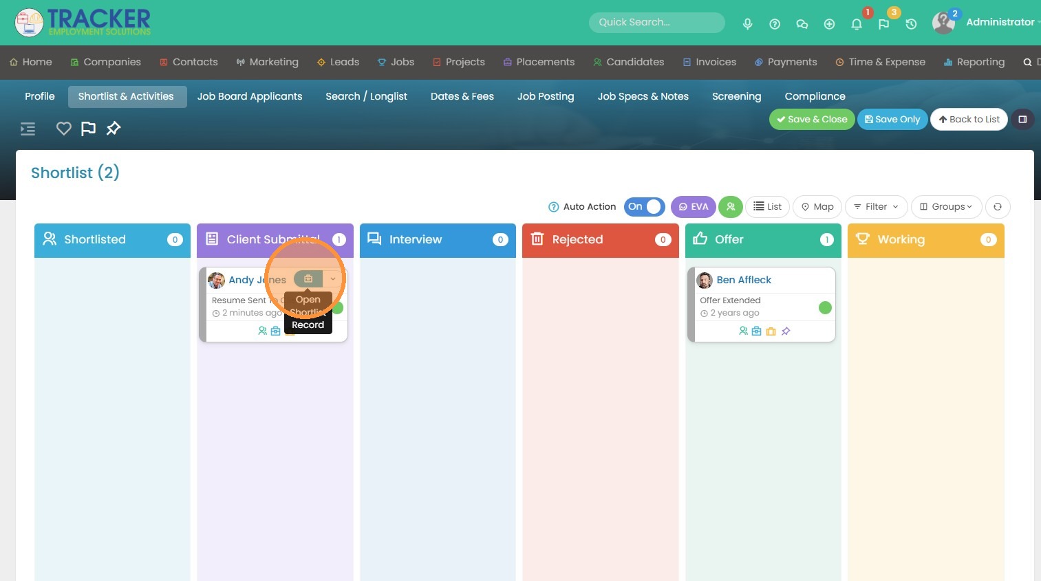 11. Moving on, we have an Auto Action button off to the right here (if you don't see this, please connect with your system Administrator). Toggling this on will make it so any time you drag a candidate forward in the shortlist, it will automatically remind you to complete the activity associated.