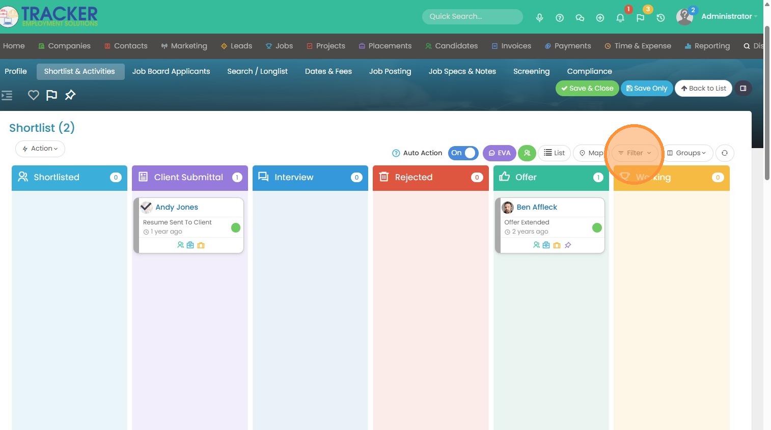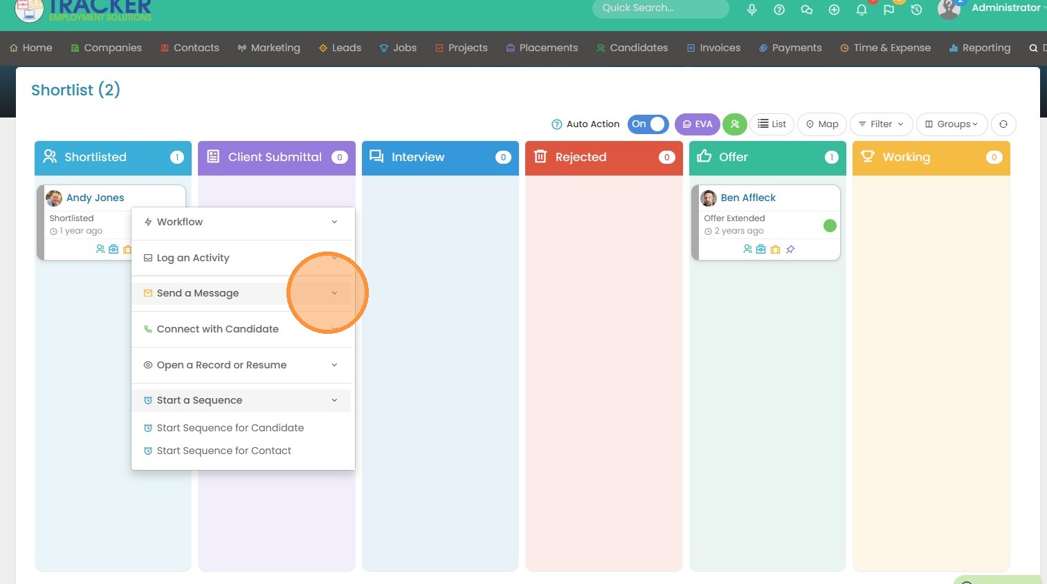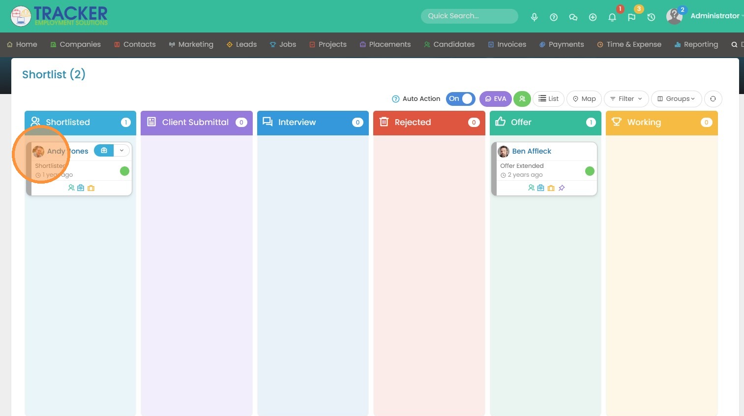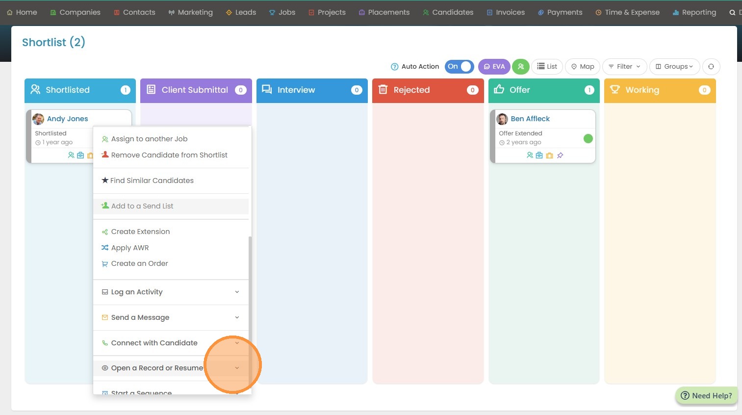 11. Moving on, we have an Auto Action button off to the right here (if you don't see this, please connect with your system Administrator). Toggling this on will make it so any time you drag a candidate forward in the shortlist, it will automatically remind you to complete the activity associated.