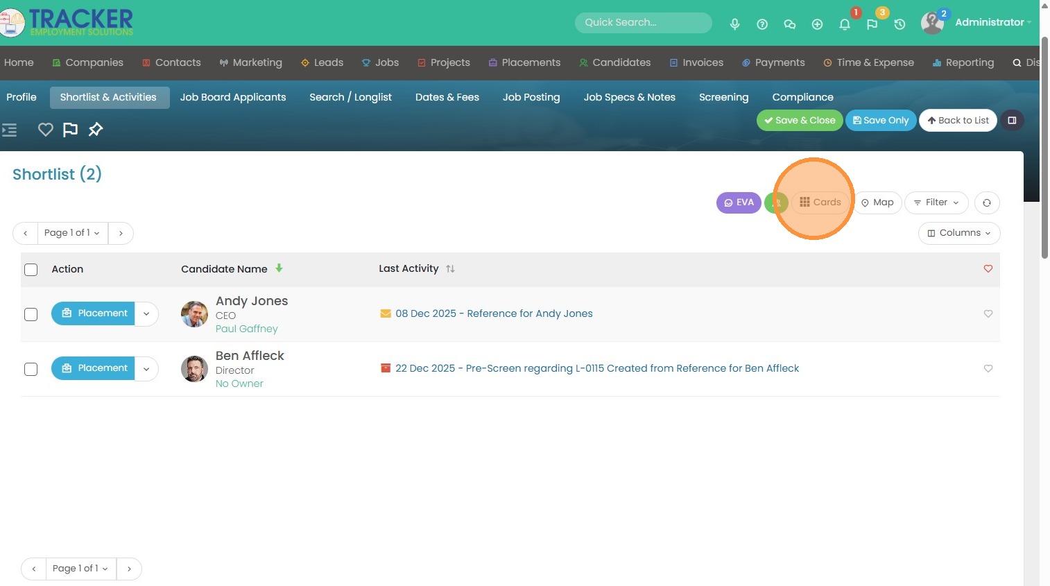 1. Currently, you're looking at the card view of the shortlist. It's a more visual perspective containing less detail than the List view (we'll get to that). To start using the shortlist, click the drop down arrow for the candidate you want to take action with.