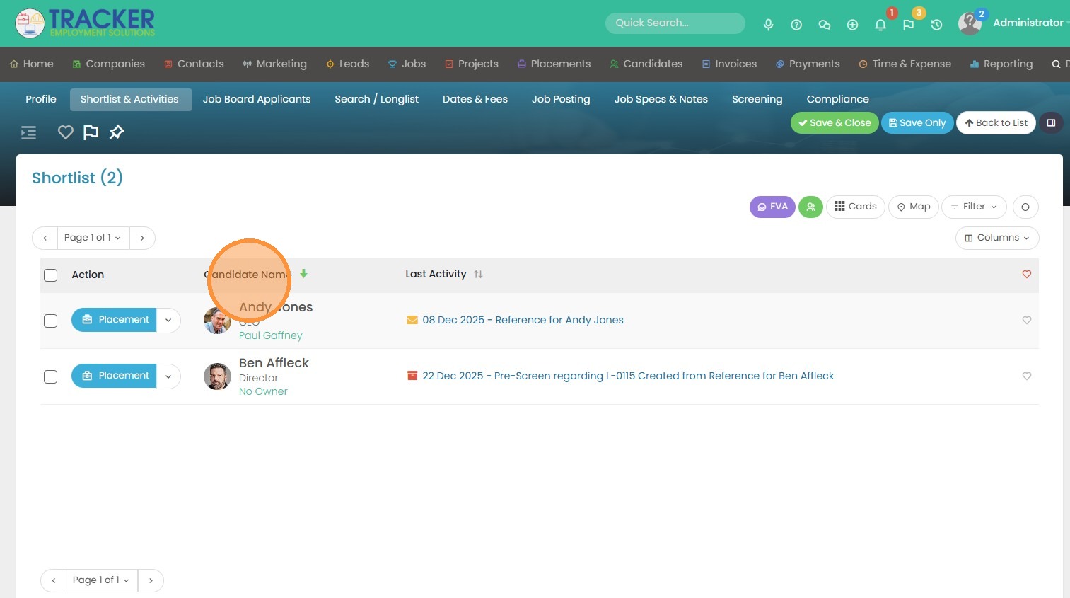 7. If you're looking to perform a bulk action / activity with these two candidates, click their profile picture. For example, click here on Andy's.