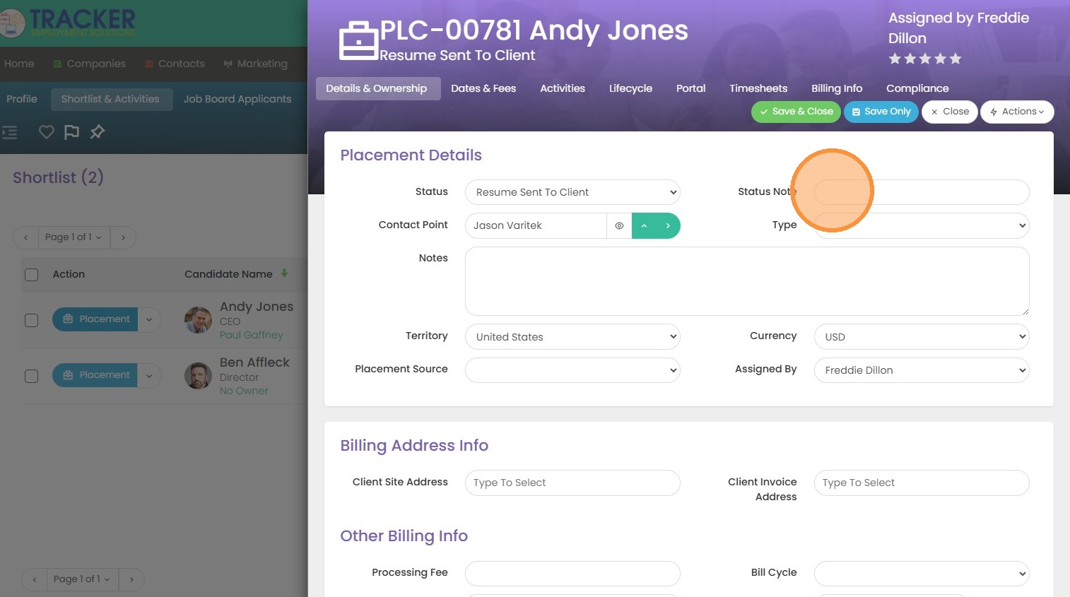 20. Click "Placement" to view the Candidate's Placement Details (such as dates & fees, placement owner etc.)