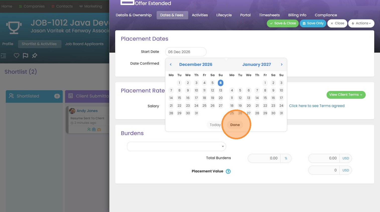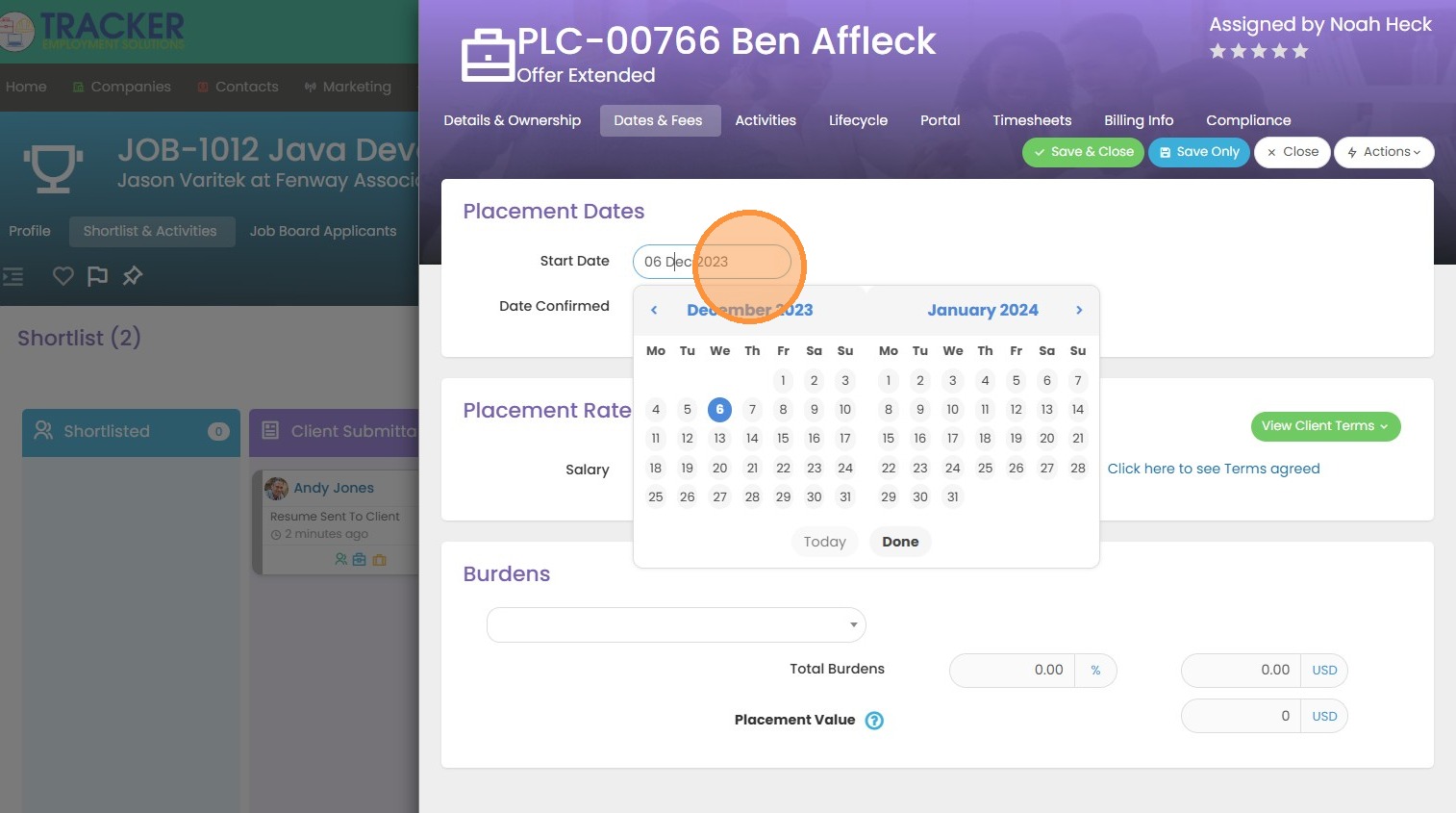 3. Click the "Start Date" field to add when this candidate will begin work. Since this is a permanent placement, I will only have a start date field (no end date).