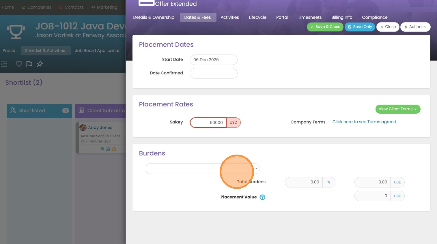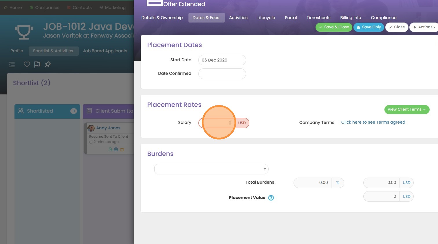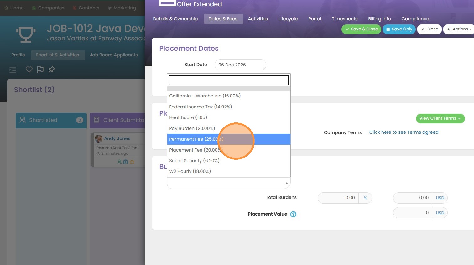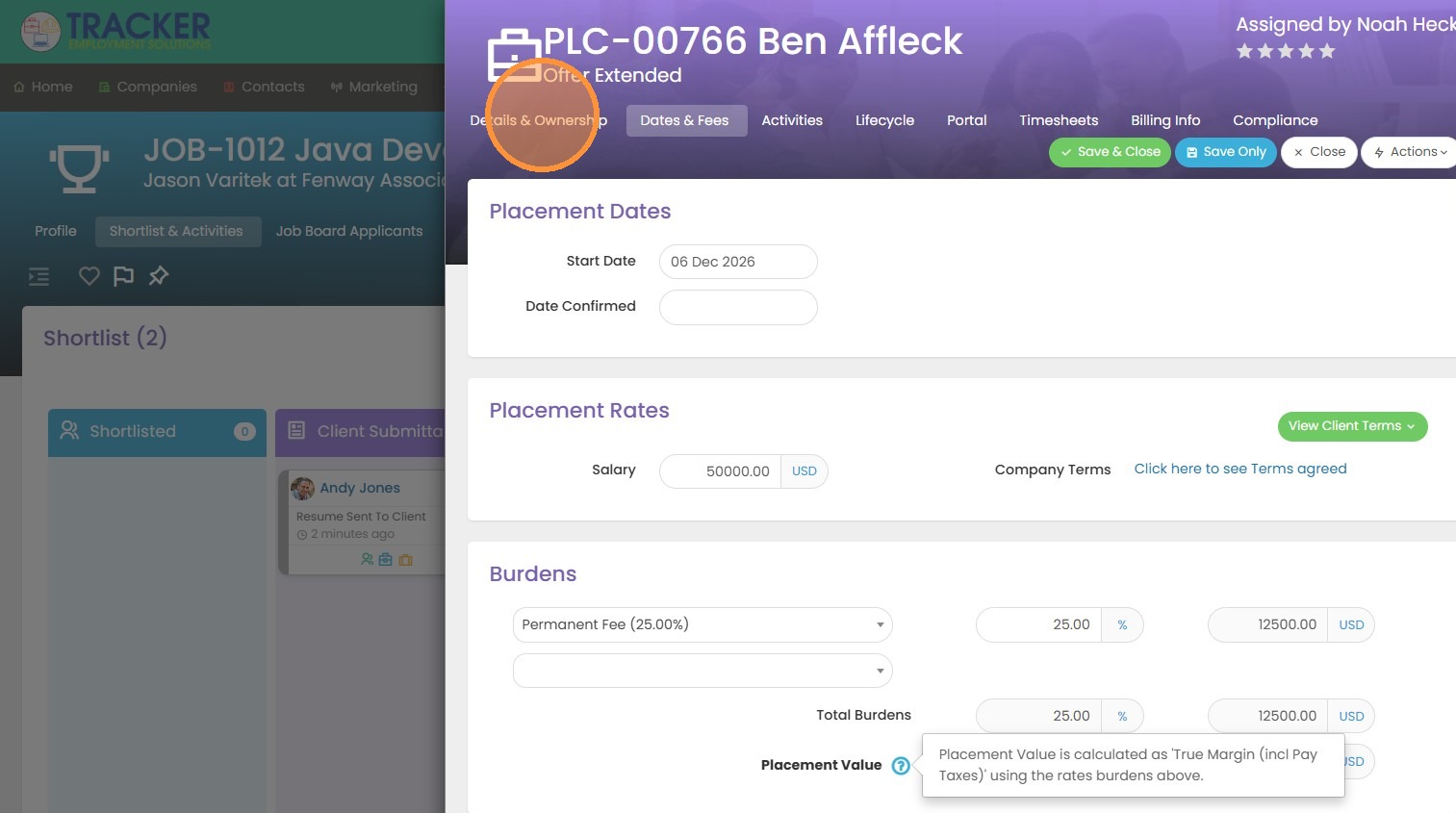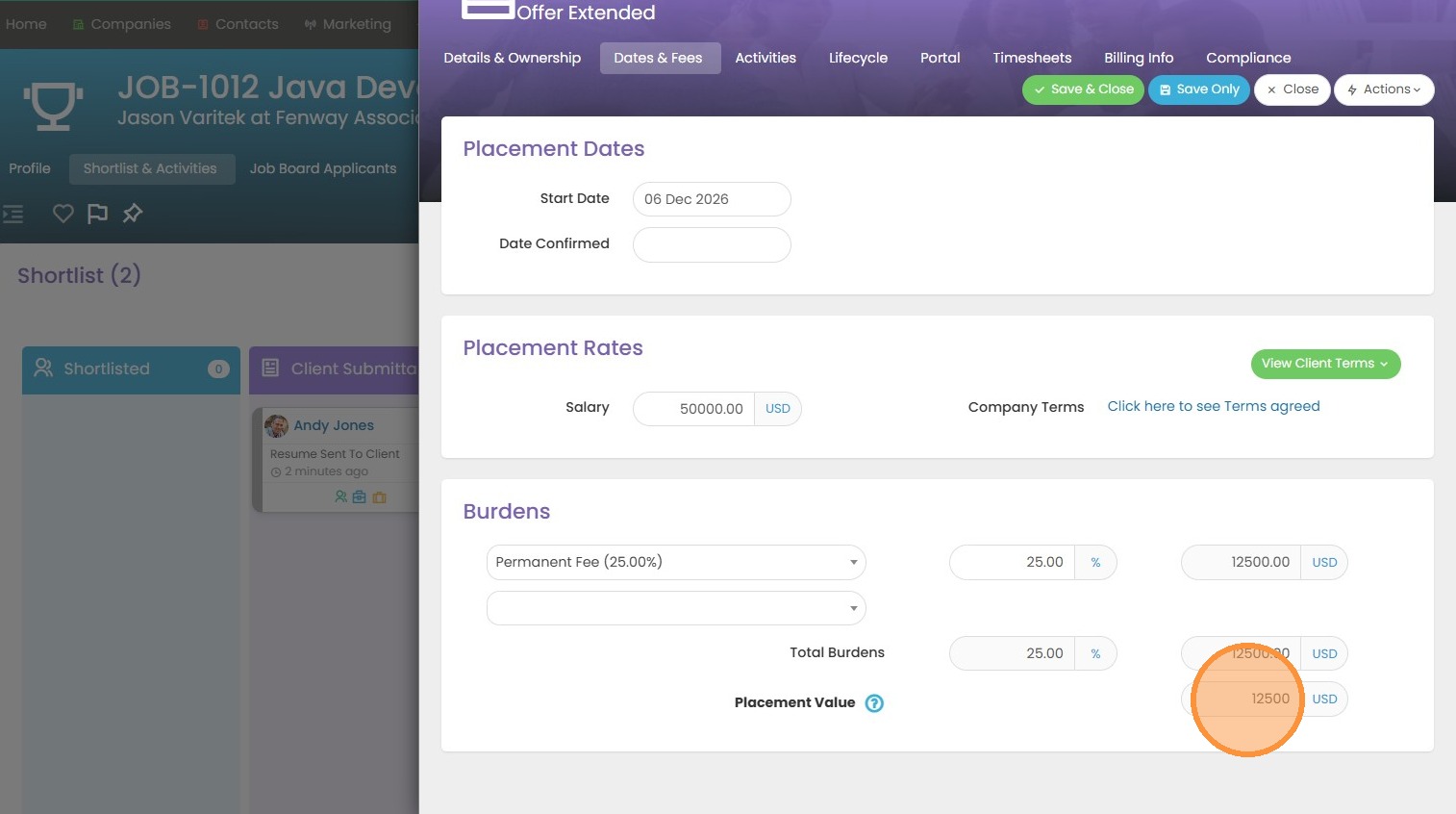 8. You will see that our placement value will auto-calculate for us based on the salary and perm fee amounts.