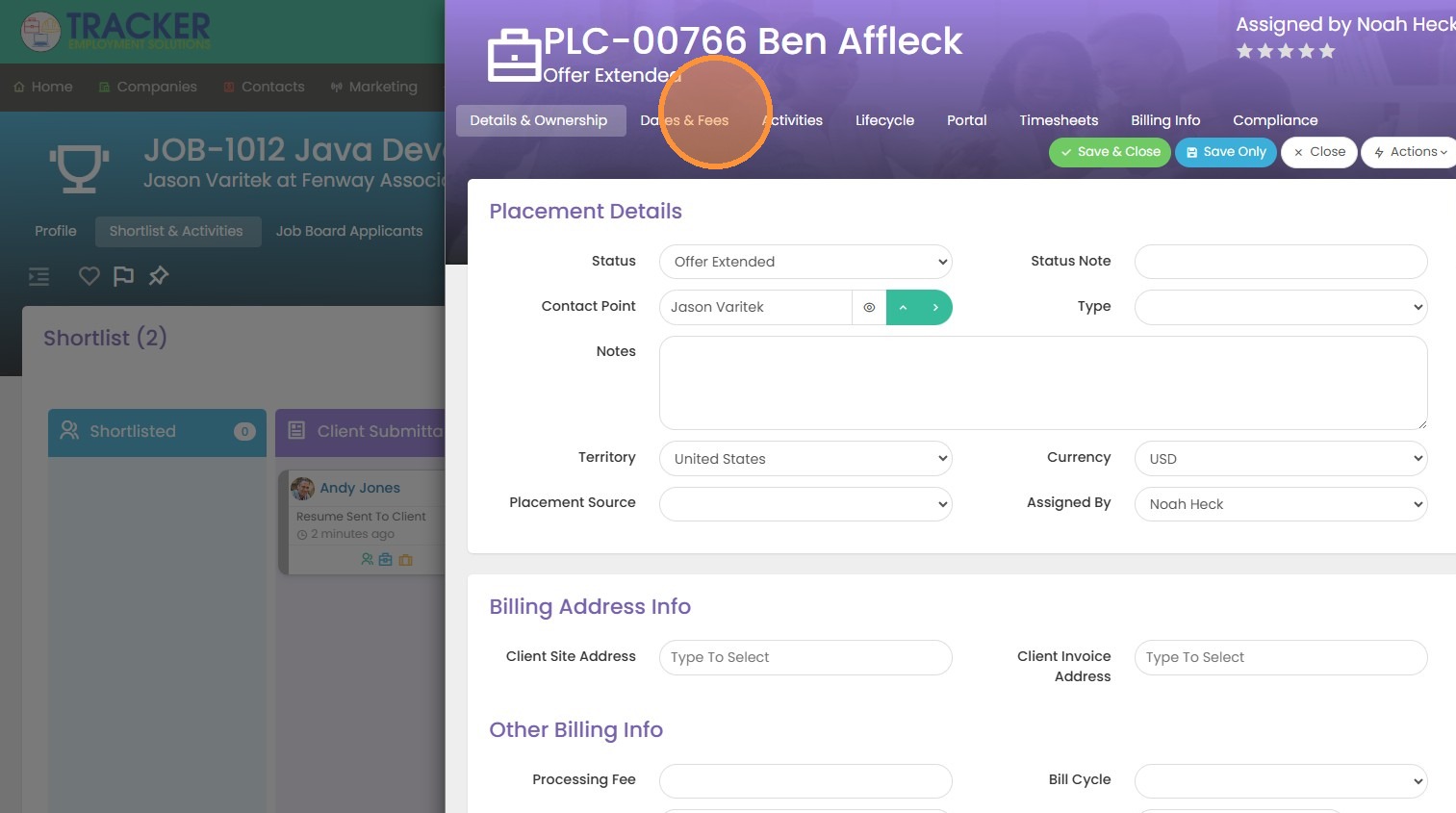 1. To edit the job dates & fees section in a placement record, open the blue placement record details on the candidate you wish to place.