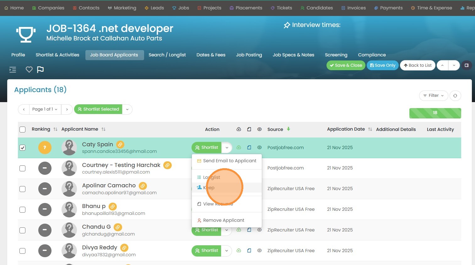 8. Click "Keep" to add the applicant into Tracker and view their resume.