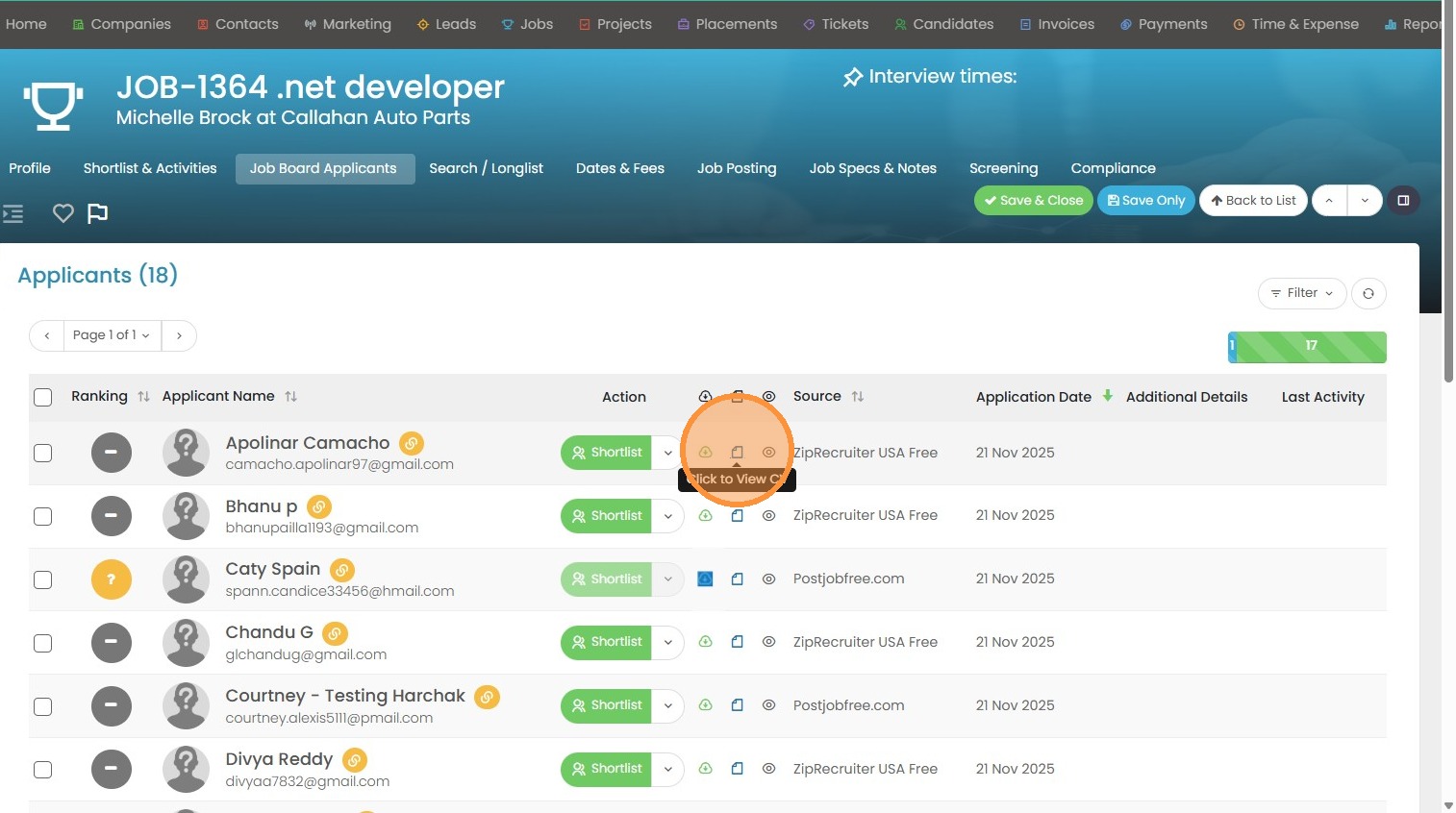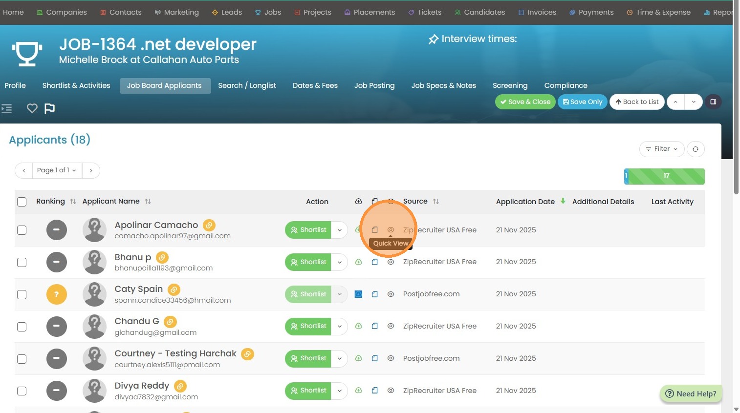 13. Or you can click the Quick View Eye to easily access the applicant's telephone number, email etc.