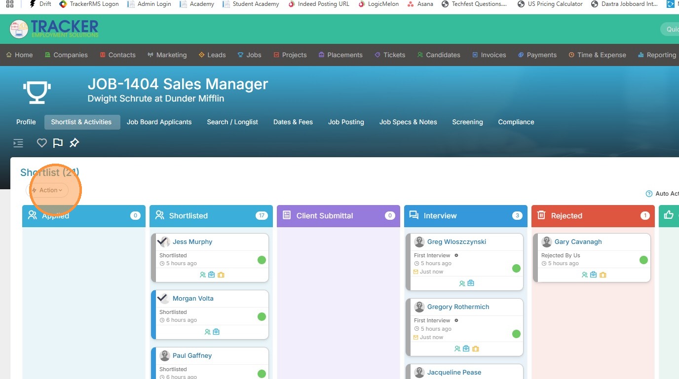 1. Enter into the Job you would like to work in and click the “Shortlist” menu tab. Select the candidate or candidate(s) you would like to send internally to another user at your company.