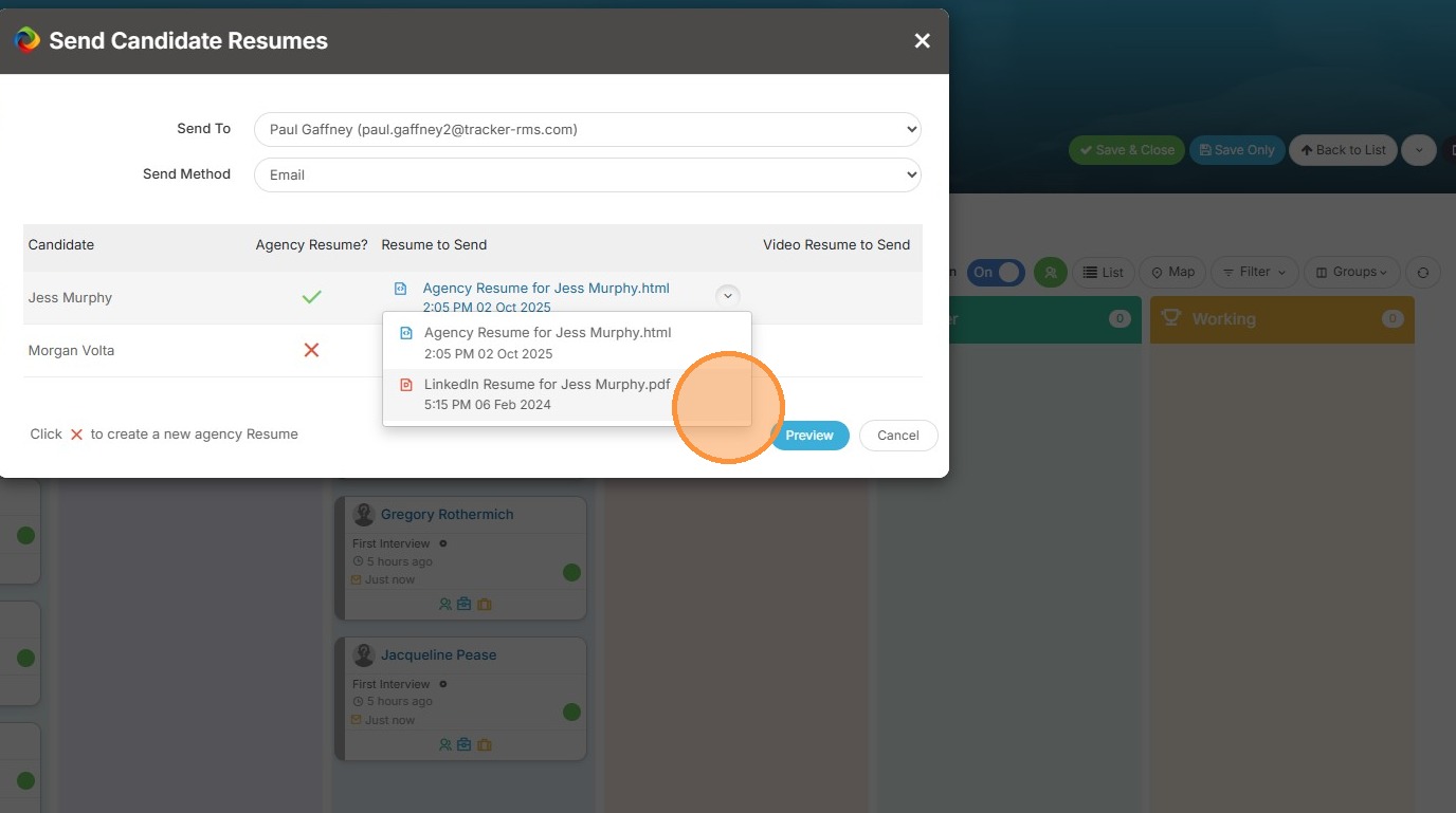 7. Pick the resumes you want to send by clicking this dropdown arrow.