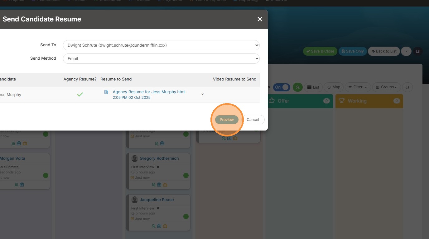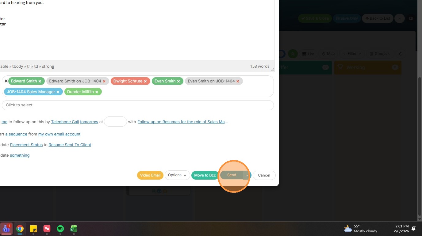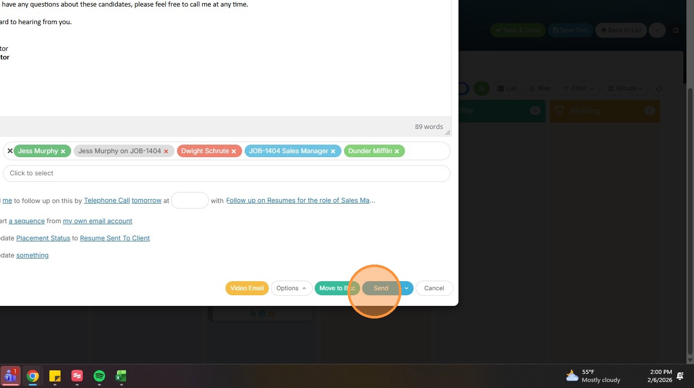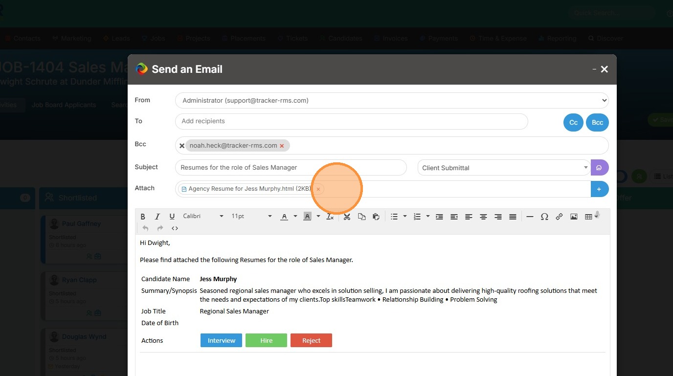 8. You can see the resume is automatically attached, and the default email template is our Client Submittal template. You can still edit this email before it goes off if needed.