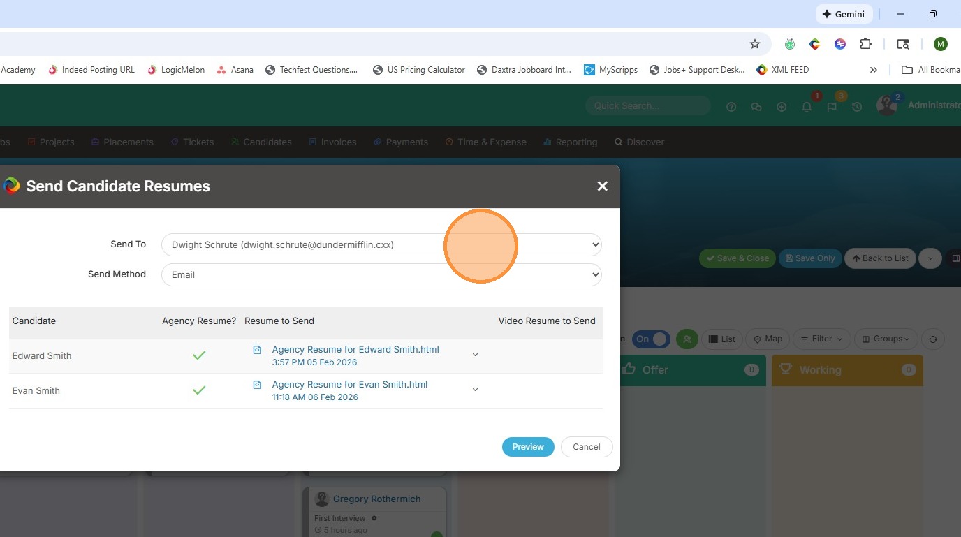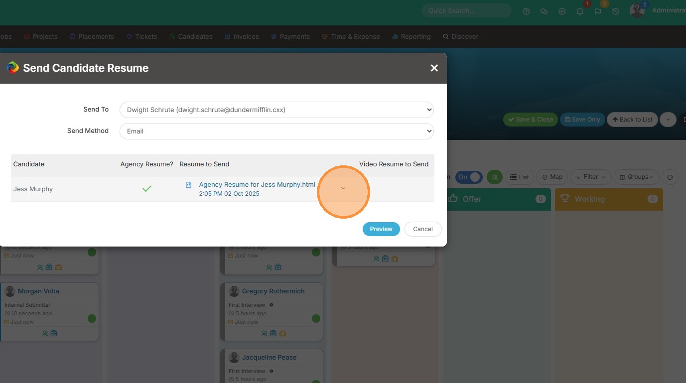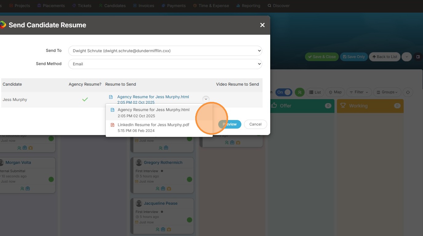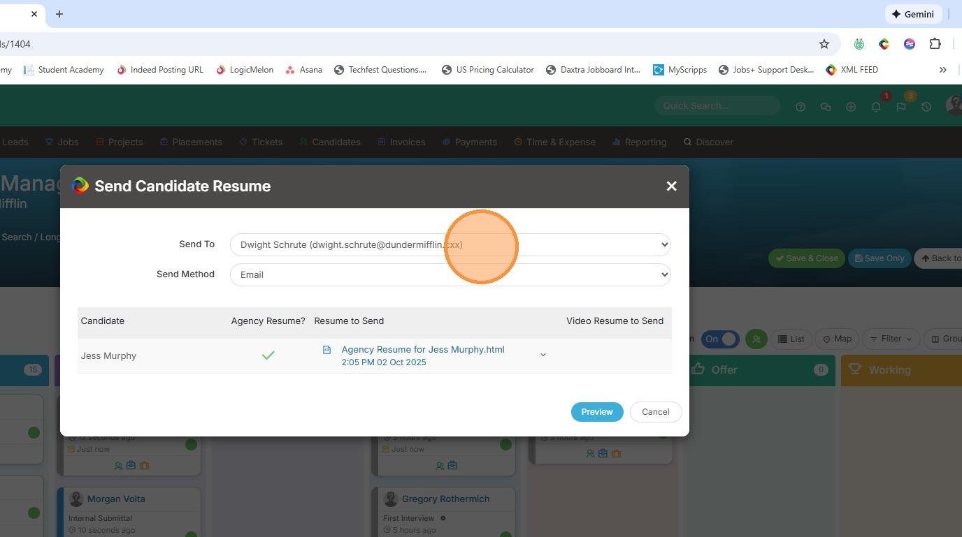 8. You can see the resume is automatically attached, and the default email template is our Client Submittal template. You can still edit this email before it goes off if needed.