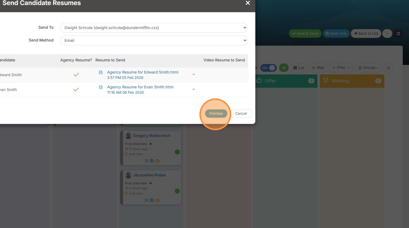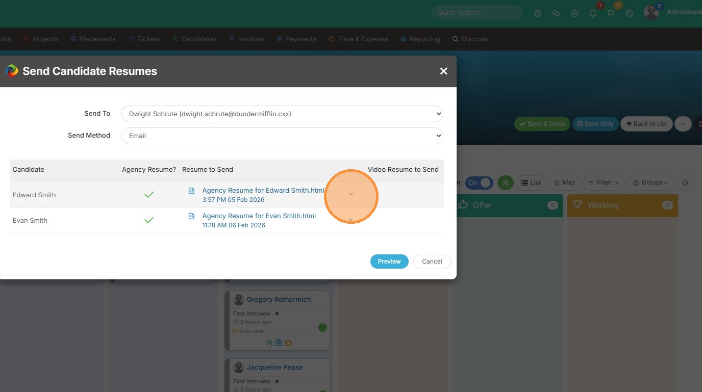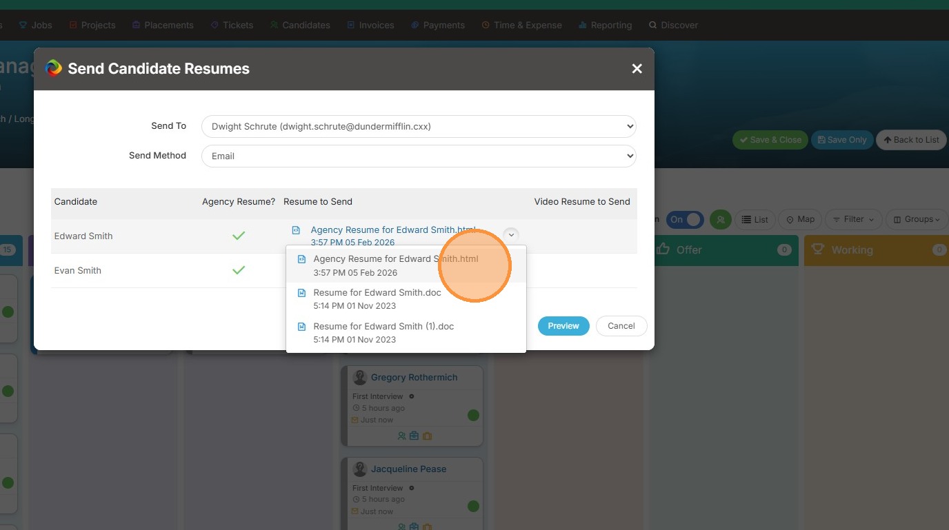 11. To send multiple resumes to a client, select the candidate's by clicking on their photo icon.