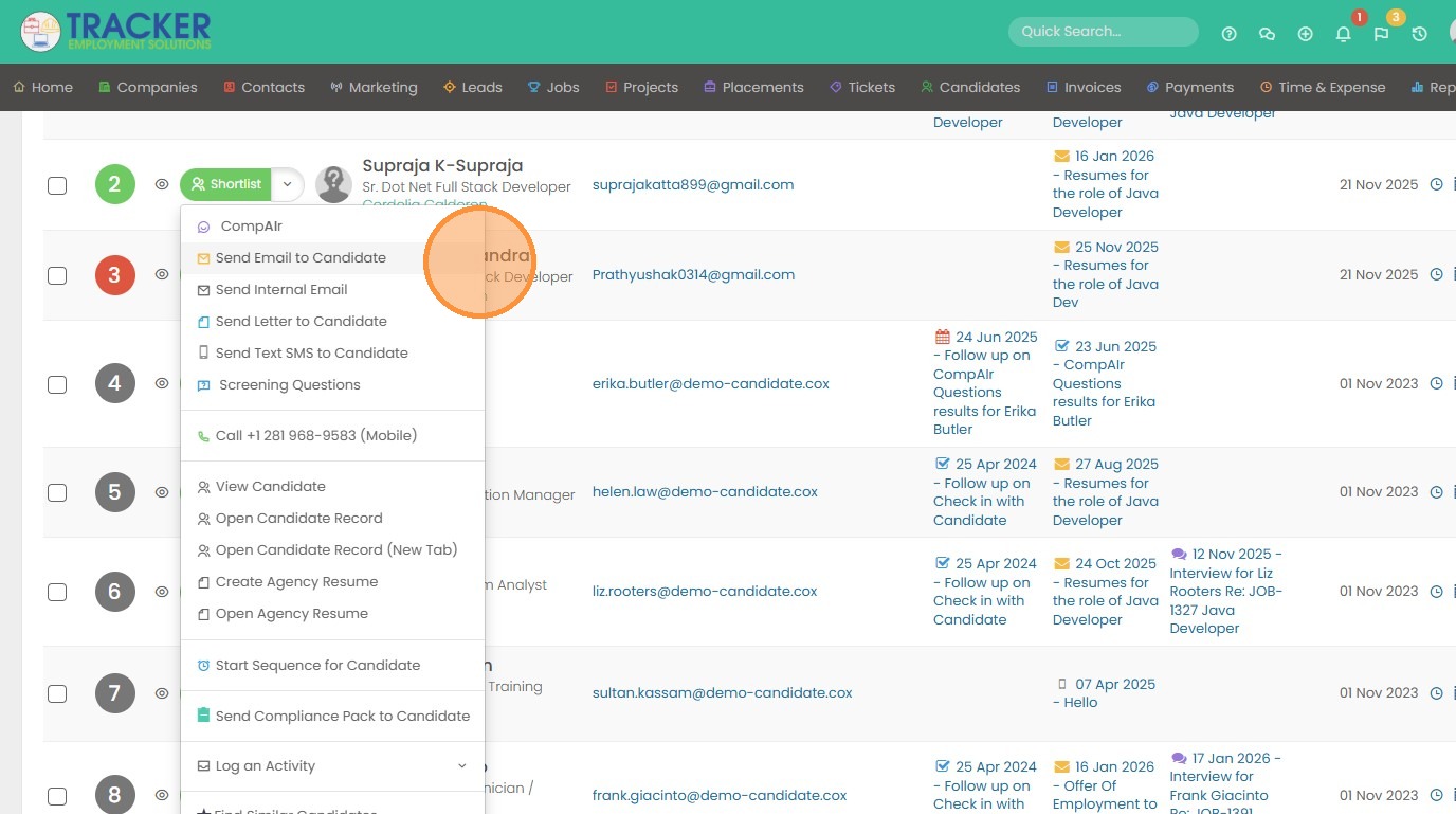 4. At the top we have our CompAIr option (which will compare the candidate's resume against the job description. Below that, you will see all communication options from emailing to calling, texting or sending screening questions.