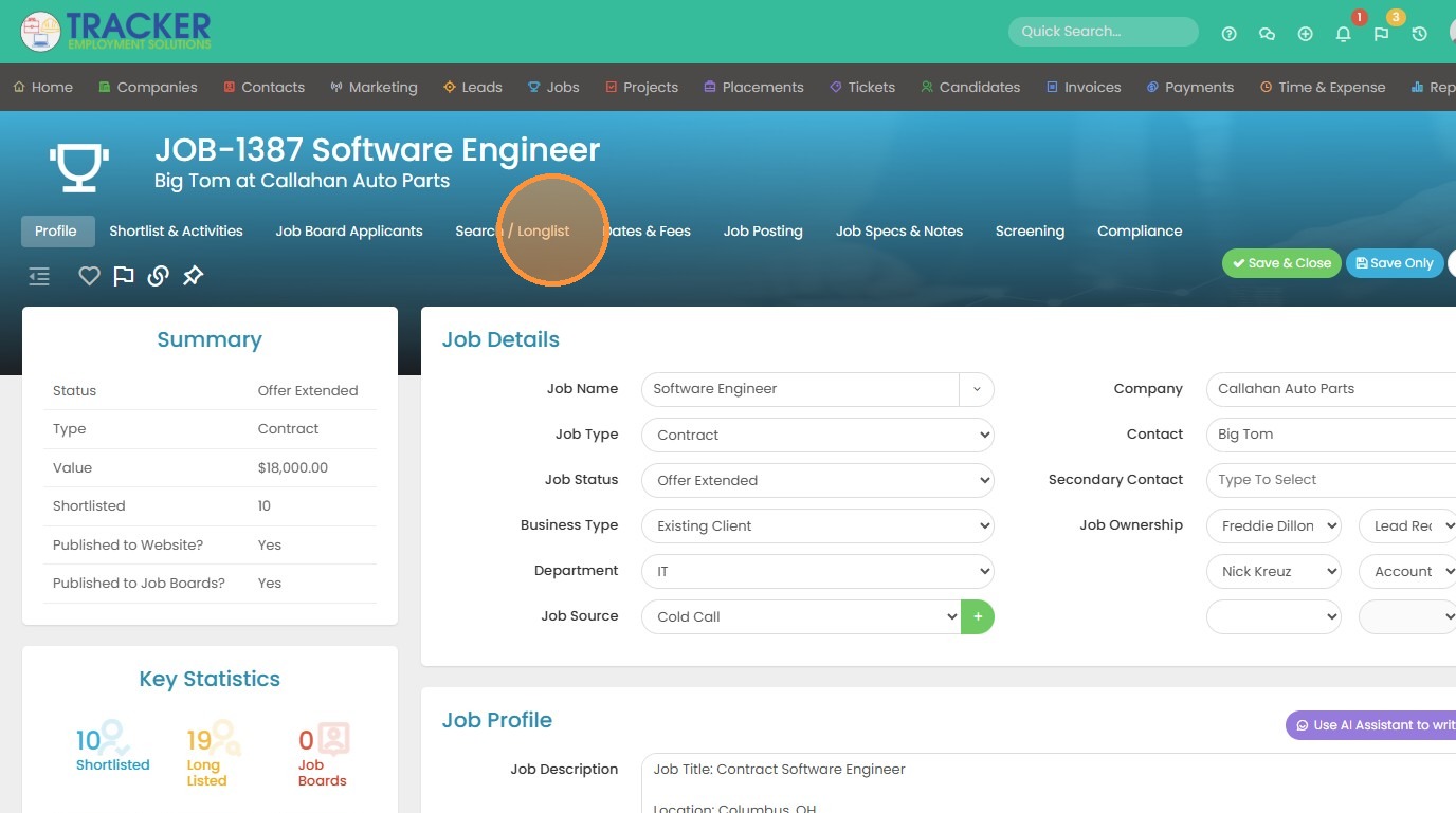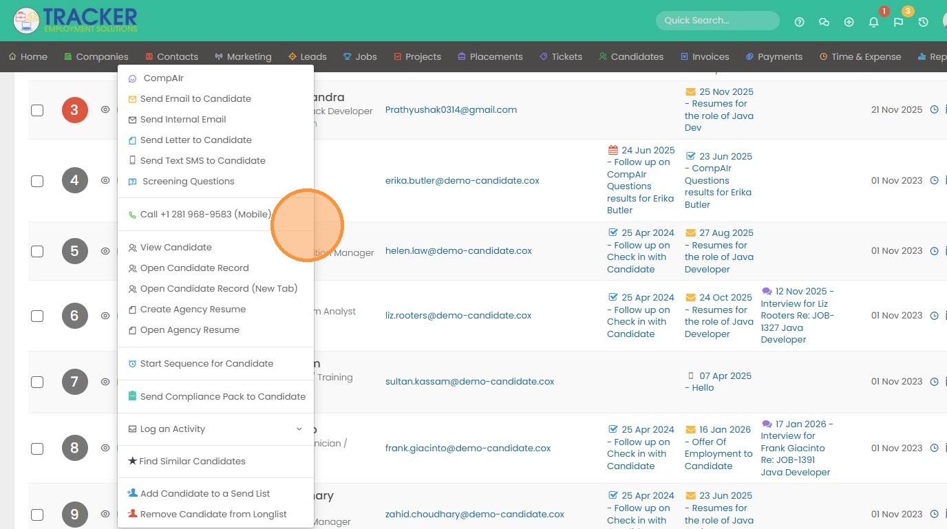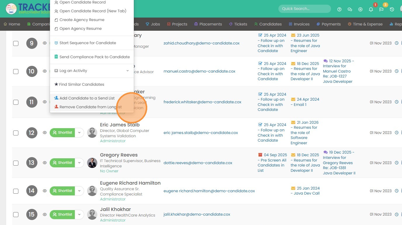 5. Next you have options to view the candidate. The View Candidate option will show you a quick view. Next, you have options to open the candidate record or create/open an agency resume.