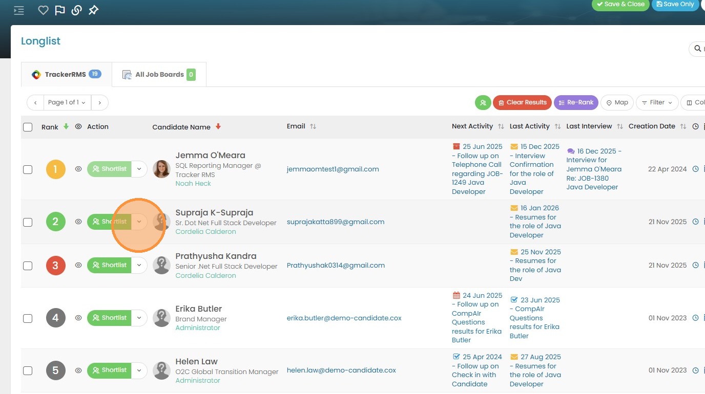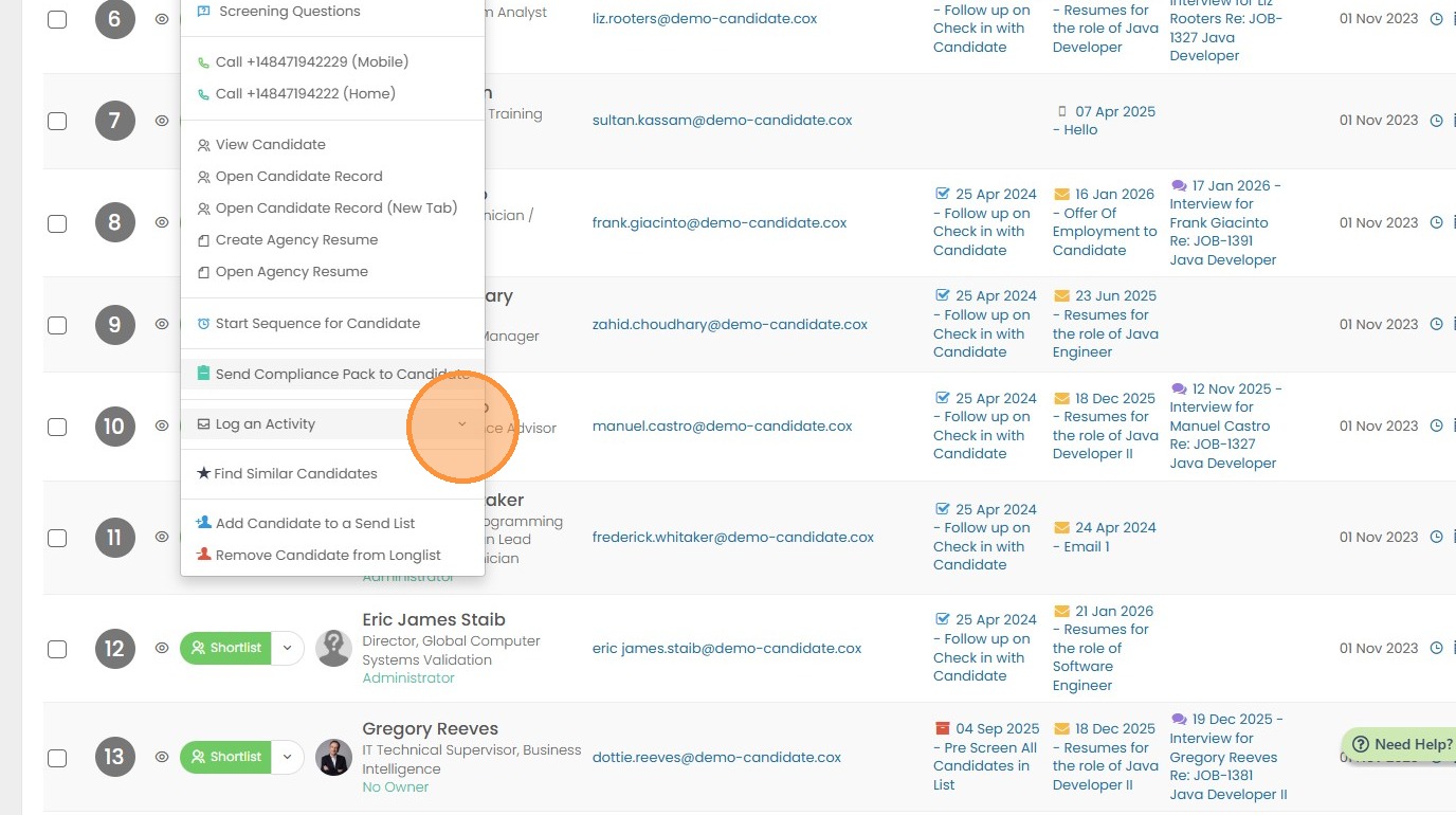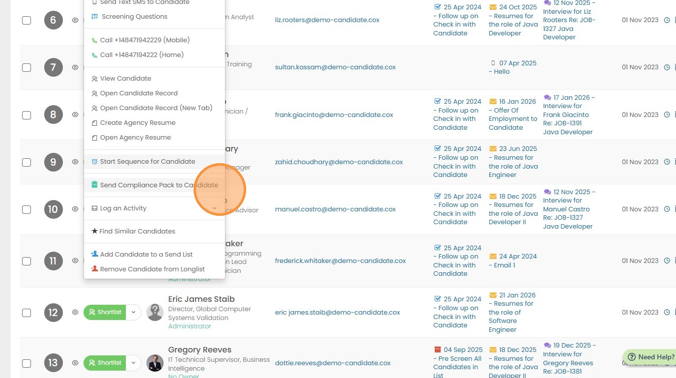 3. Here you will notice you have an action column. If you don't see this, go to columns on the far right and add it. Clicking the dropdown arrow will open the action menu for this candidate.